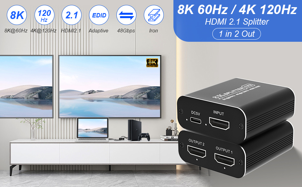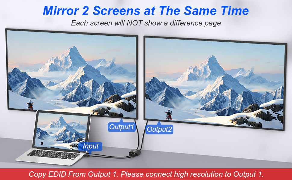 【إدارة EDID التكيفية 】يدعم دقة 8K@60 هرتز، وتقنية HDR الديناميكية وVRR. يمكن لموزع HDMI 2.1 1 في 2 إخراج 8K في وقت واحد. أو إخراج 8K/ 4K بشكل متكيف، عندما تكون دقة الشاشتين مختلفة، على سبيل المثال، إحداهما 8K عند 60 هرتز والأخرى 4K عند 120 هرتز، ستعرض الشاشتان 8K و4K على التوالي، ولكن لن تعرض كلاهما 4K. *يُرجى إعطاء الأولوية لتوصيل الشاشة ذات الدقة الأعلى بمنفذ HDMI Output 1.