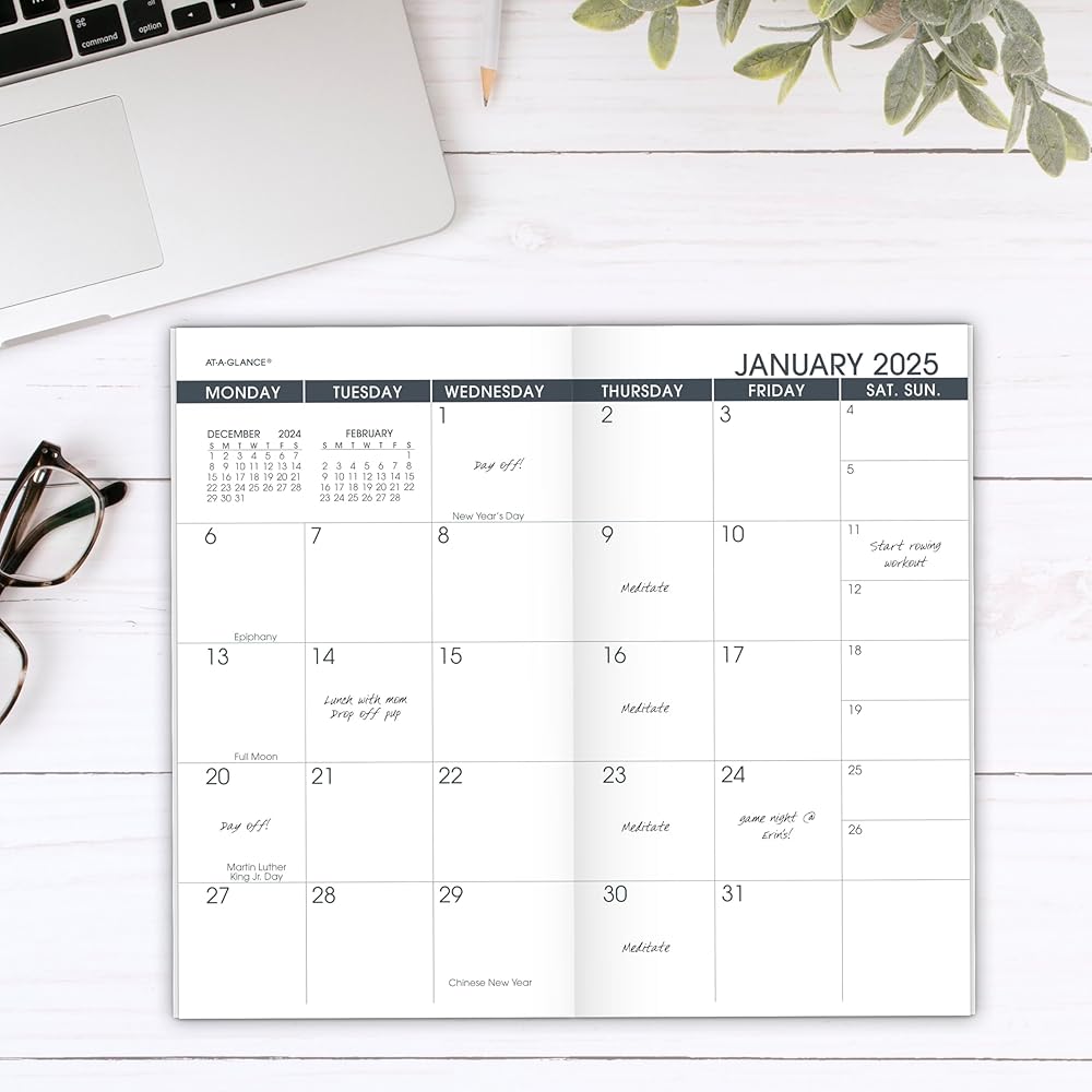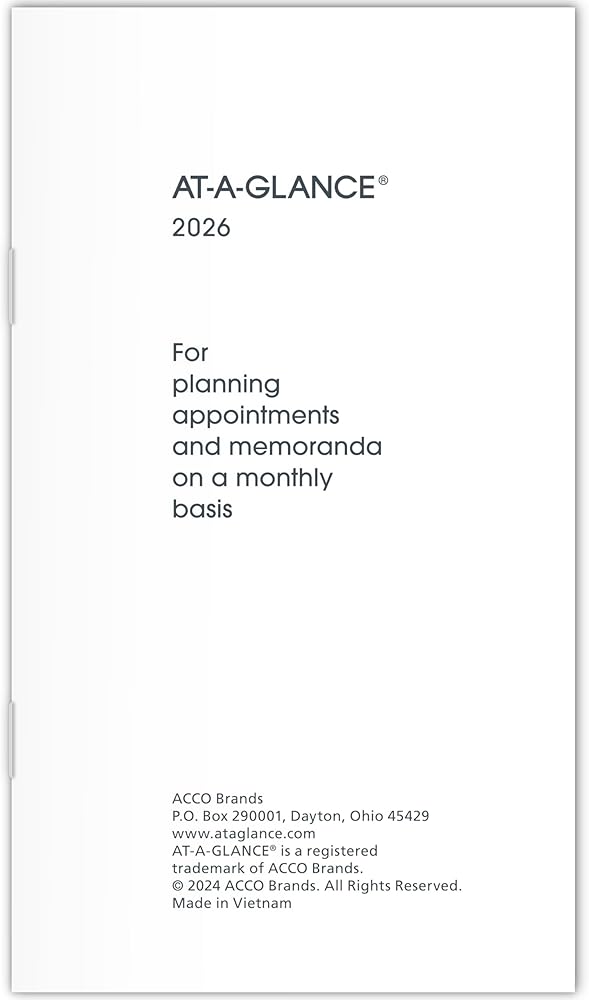 Confidently face every deadline this year with the AT-A-GLANCE Monthly Planner Refill. Date range covers 12 months from January 2025 — December 2025. Plan your schedule without fear of distracting ink bleeding. High-quality paper is designed for ink bleed resistance, which keeps plans neat and legible. Great for long-term planning, each month covers two pages. Monthly spreads feature unruled weekday blocks and half-size weekends for open scheduling. Past and future reference calendars included on each page for quick date checking. Pages measure 3-1/2" x 6". Daily blocks measure 1-1/8" x 1-1/16". Expand your organizational skills with special pages. Includes 2-year reference calendar, contacts pages, personal information and notes pages. This refill fits in AT-A-GLANCE Monthly Pocket Planner (70-064), sold separately.