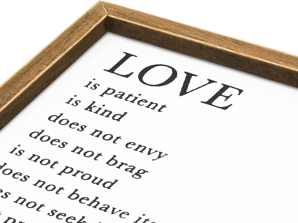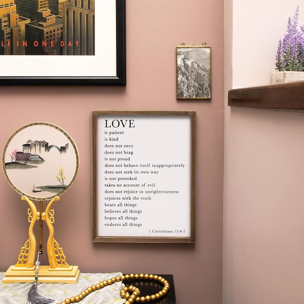 يأتي مع: سوف تحصل على لوحة فنية جدارية معلقة واحدة تتميز بإطار خشبي وقماش مع آية من الكتاب المقدس من 1 كورنثوس 13: 4-7 مكتوب عليها "الحب صبور"