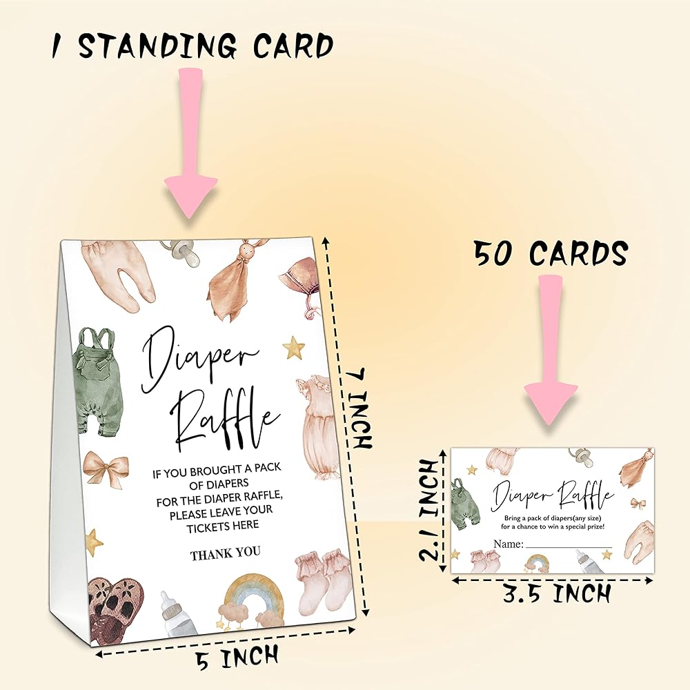 • PACKAGE & SIZE - Each package includes 1 standing sign and 50 guessing cards! The standing sign measures 5 in x 7 in and diaper raffle tickets measure 2.1 in x 3.5 in!