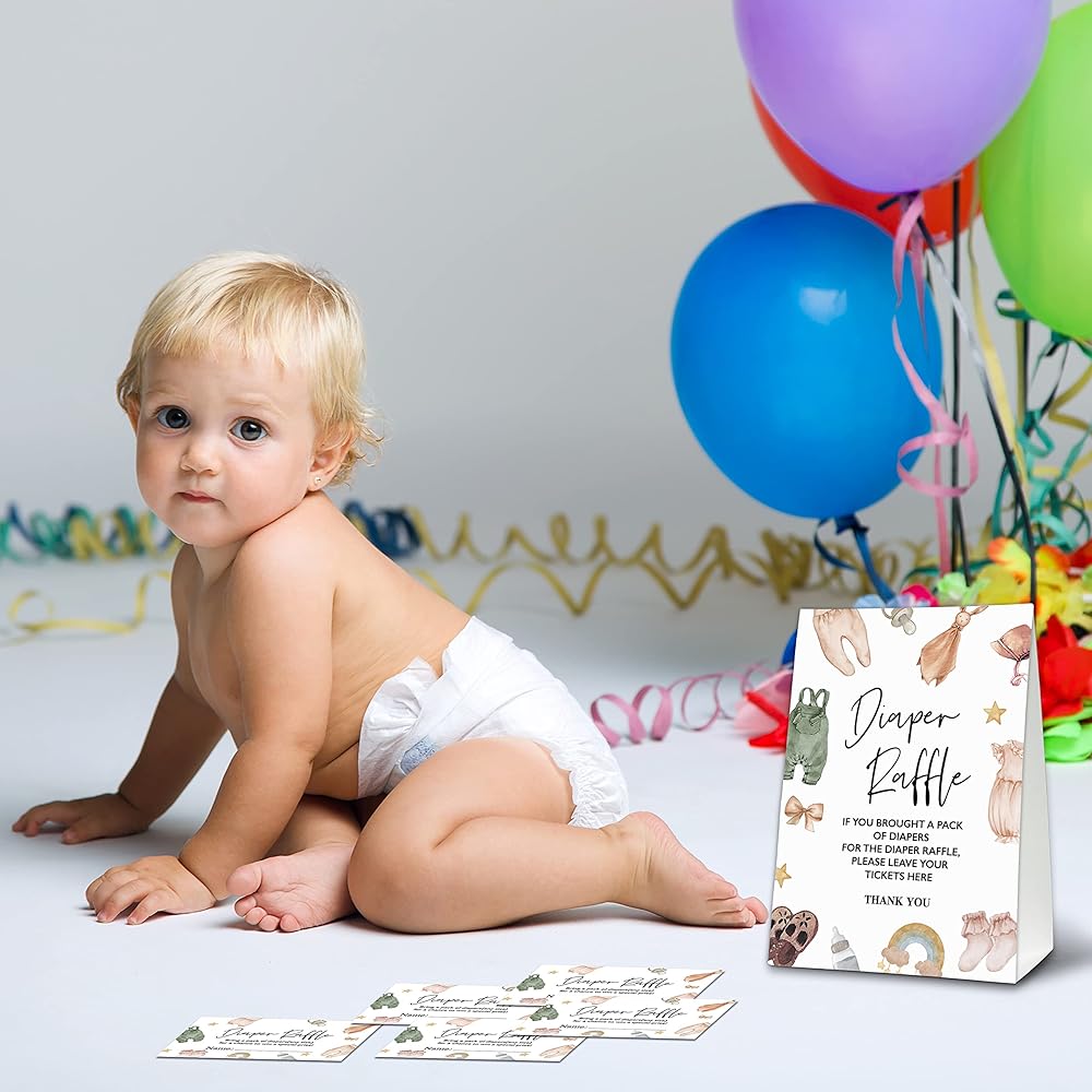 PACKAGE & SIZE - Each package includes 1 standing sign and 50 guessing cards! The standing sign measures 5 in x 7 in and diaper raffle tickets measure 2.1 in x 3.5 in!