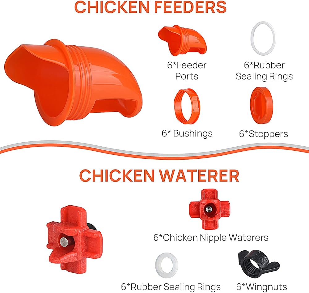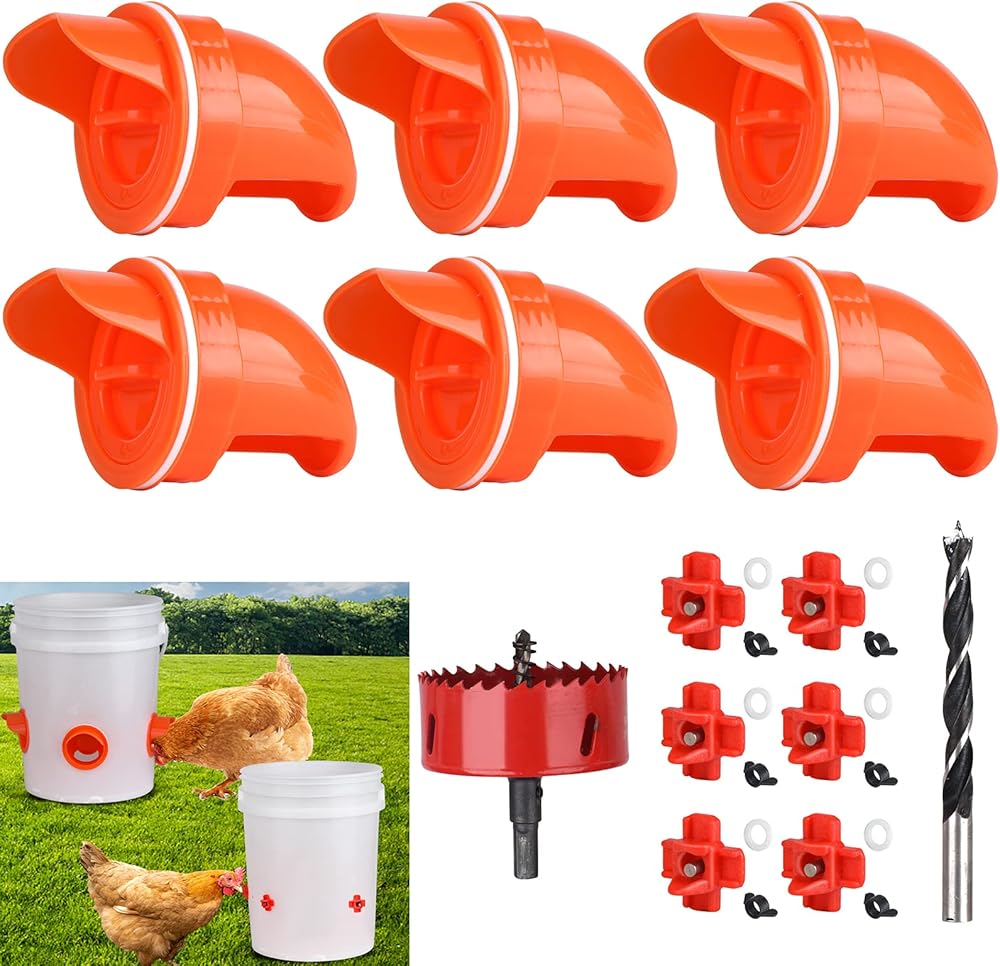 مجموعة أدوات تغذية الدجاج ومياه الدجاج الأوتوماتيكية من Diggtek بدون نفايات، 6 منافذ مع 6 حلمات مياه للدجاج، مجموعة أدوات تغذية الدواجن المقاومة للقوارض والمطر للدلاء والبراميل والصناديق والأحواض