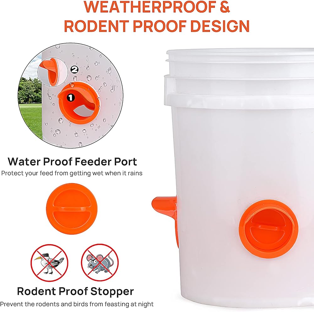 🐔【مقاوم للطقس والقوارض】: يحتوي منفذ التغذية على غطاء ممتد كدرع مطر لمنع تدفق المطر داخل وحدة التغذية. تمنع الحلقة المطاطية تسرب الماء بين المنفذ والحاوية، وتحافظ على الطعام جافًا. غطاء سدادة الفئران يمنع المخلوقات والطيور البرية من سرقة الأعلاف.