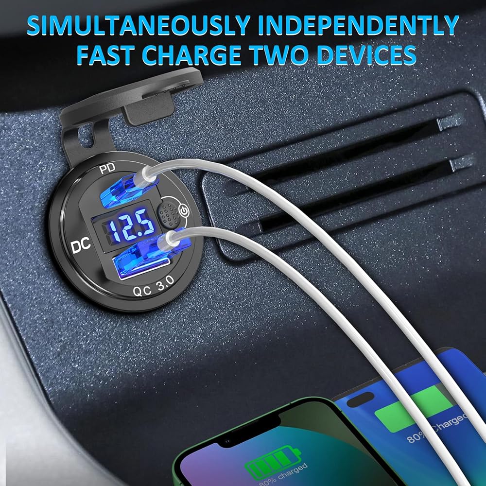 👍[فولتميتر LED ومفتاح الطاقة]: تم تجهيز منفذ USB 12 فولت بمقياس جهد USB LED أزرق، والذي يقوم تلقائيًا بمراقبة جهد السيارة ويعرض حالة جهد بطارية السيارة. يتيح لك زر التشغيل/الإيقاف المحسن المضاد للانزلاق التحكم في استخدام شاحن السيارة بسهولة أكبر.
