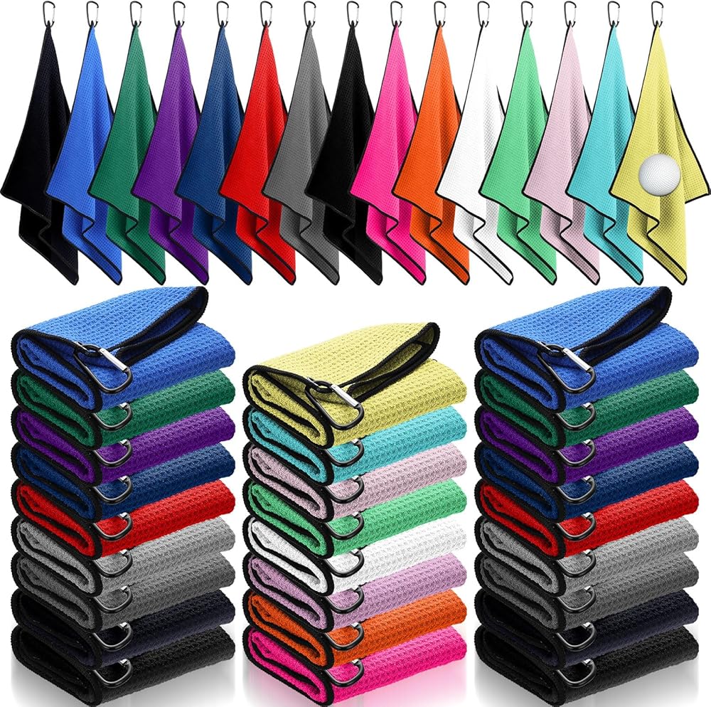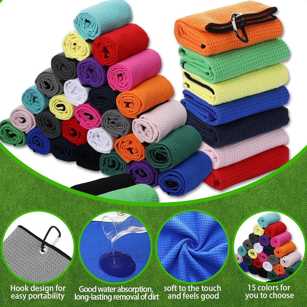 منشفة جولف من باتيير 30 قطعة لحقائب الجولف مقاس 40.64 سم × 60.96 سم، منشفة جولف من الألياف الدقيقة مع مشبك بنمط وافل لحقائب الجولف، واللياقة البدنية، والتخييم، والمشي لمسافات طويلة، واليوجا (متعددة الألوان)