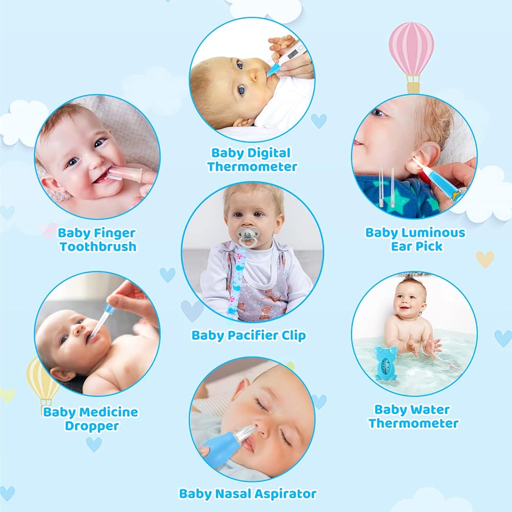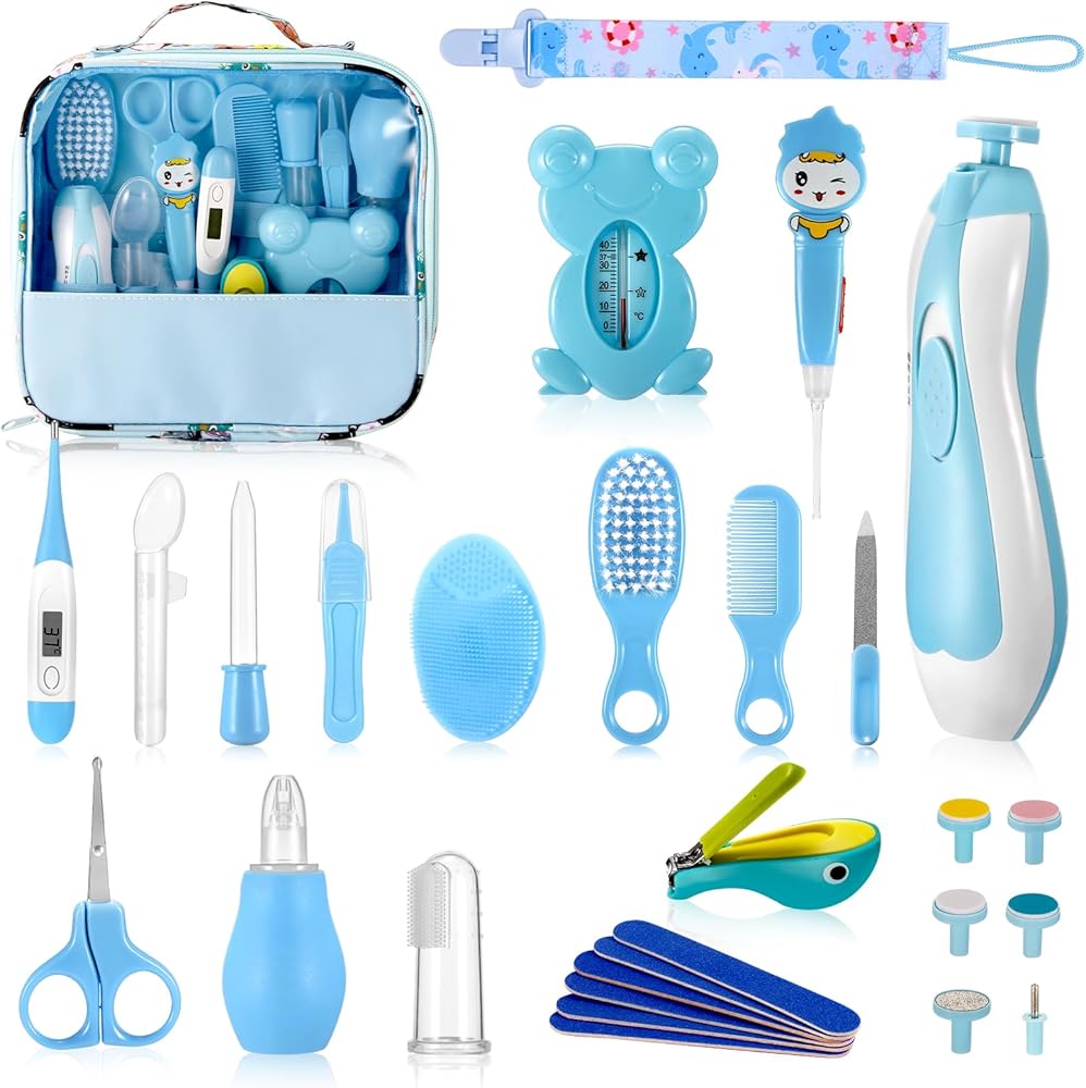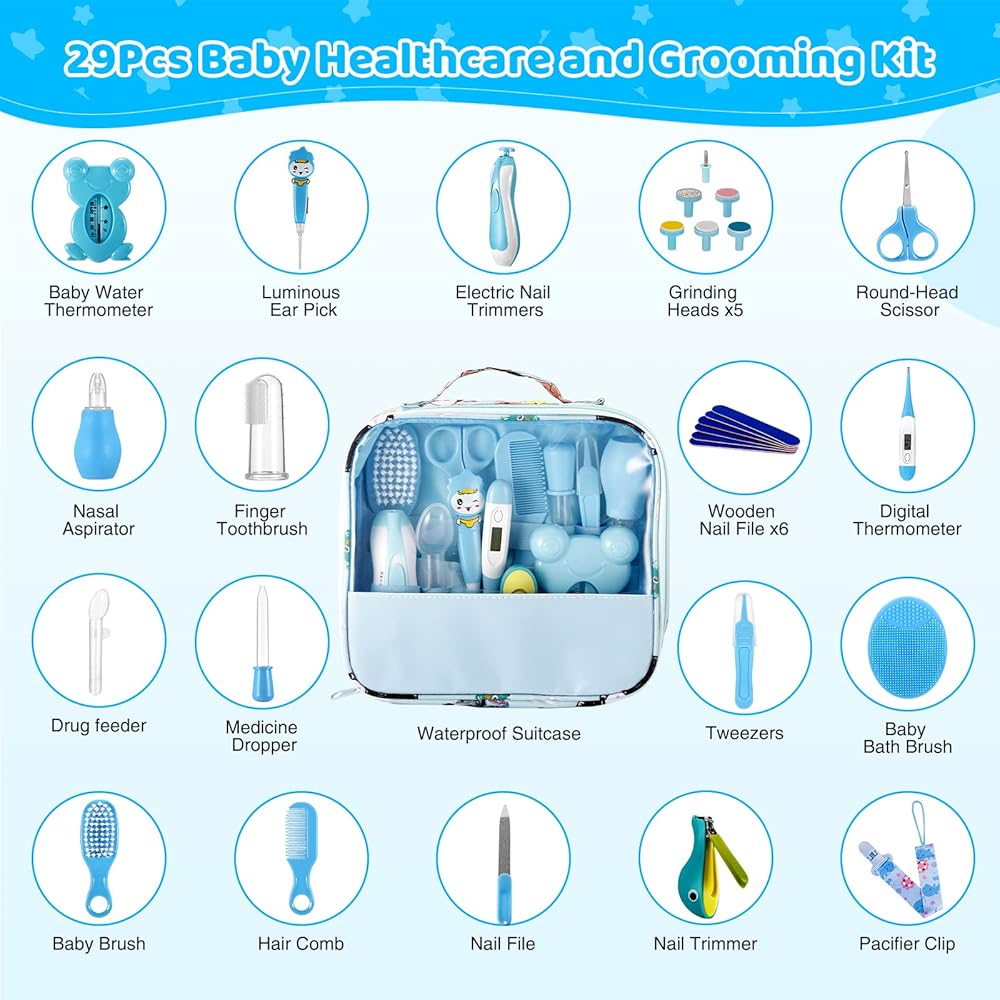 baby nail clippers, rounded safety scissors, electric nail trimmers, 6 grinding heads, nasal suction, baby brush, baby comb, baby bath brush, pacifier clip for baby, baby feeder dropper, tweezers, finger toothbrush, Earwax spoon LED light and cute portable suitcase