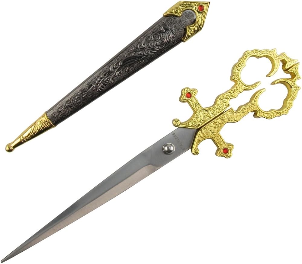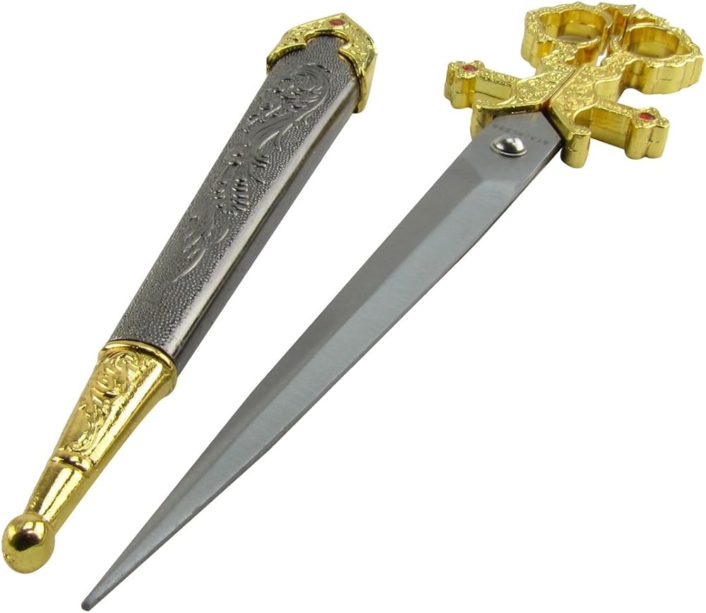 Add a beautiful and elegant item to your desk with this set of new 10" vintage style medieval dagger & sheath scissors. This medieval envelope knife is intricately detailed with its floral designs and red gems, made to look like an art knife & sheath used in the Renaissance. The vintage style letter opener makes a great desk companion and the gold-tipped sheath keeps the scissors safe when not in use. The large scissors feature stainless steel blades, and measure 10 1/4" long, 2 1/4" wide, and 1/2" thick. These Renaissance style scissors, like all of our tools, ship brand new in manufacturer's packaging with our 100% Customer Satisfaction Guarantee.
