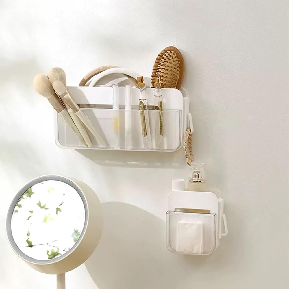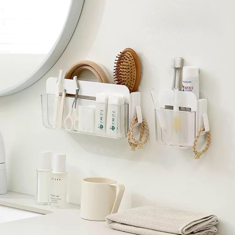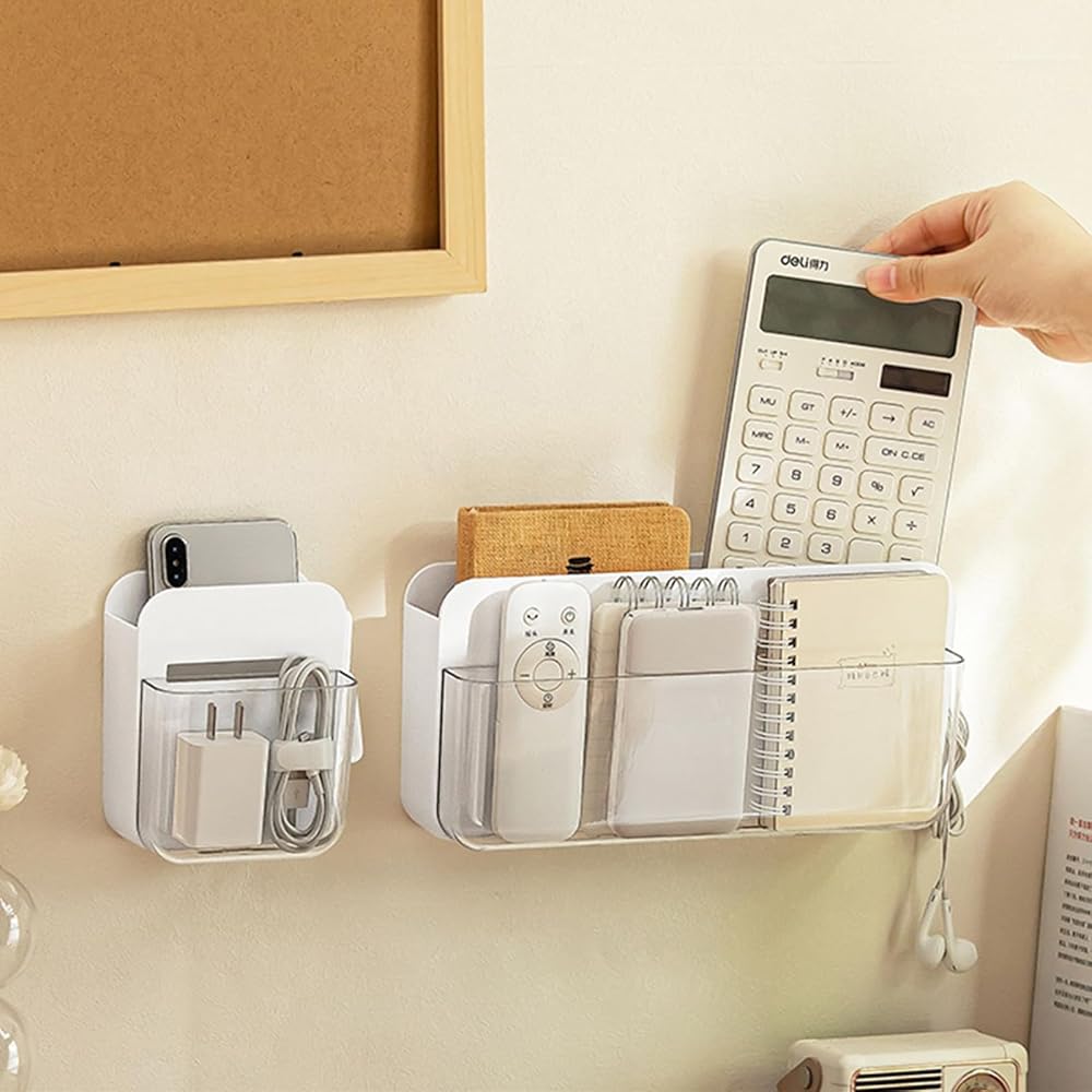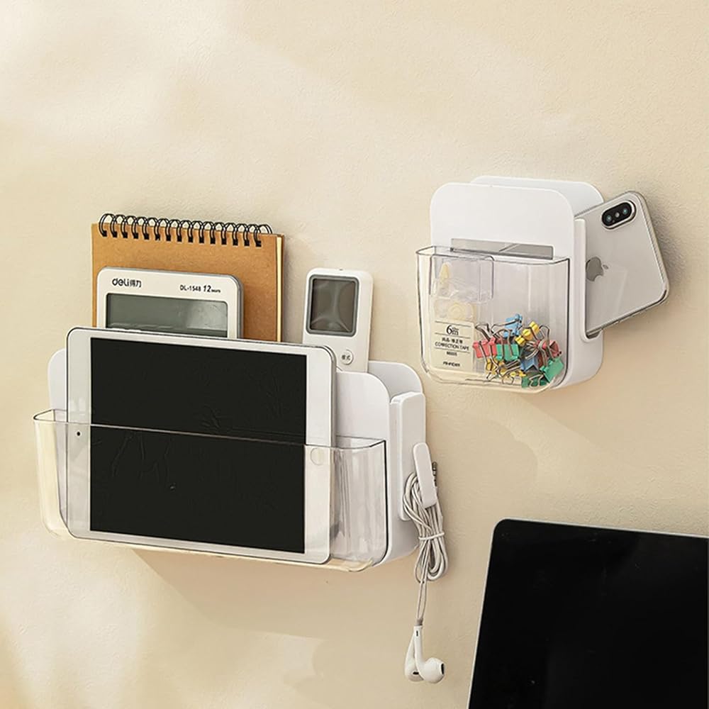 SUNFICON حامل لاصق كبير للتحكم عن بعد بطبقتين صندوق منظم للتخزين على الحائط مع خطاف وحدة تحكم مشغل وسائط التلفزيون العالمي، العلبة المنزلية والمكتب بجانب السرير ومنضدة بيضاء