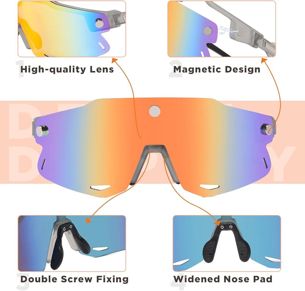 مغناطيسية معززة بثلاث نقاط: يتم تثبيت النظارات الشمسية المغناطيسية الشائعة في السوق بواسطة مغناطيس على الجانب، مما قد يسبب عدم كفاية الشفط والسقوط عند ارتدائها لفترة طويلة. والتصميم المغناطيسي الذي أضفناه في المنتصف يمكن أن يعزز ملاءمة القطعة المغناطيسية مع إطار النظارات الشمسية لمحبي الرياضة، وليس من السهل أن تسقط.