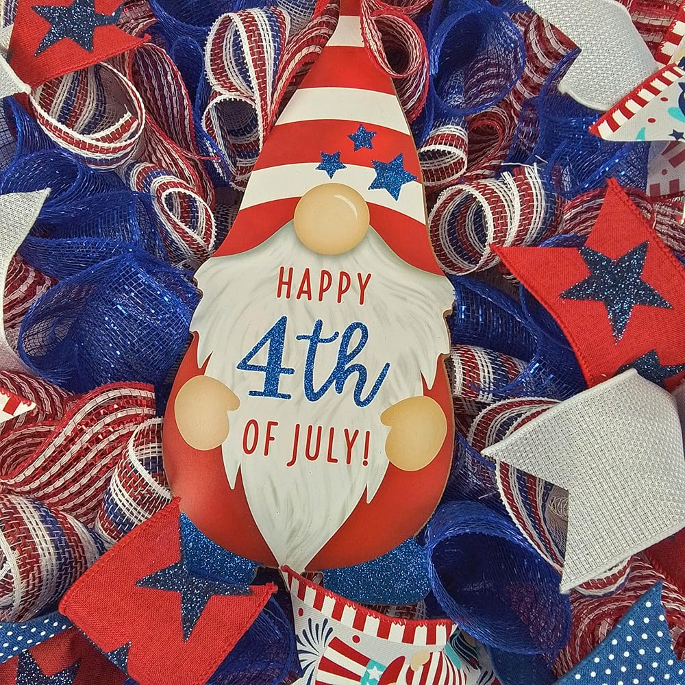 This ready to ship wreath is made with red, royal blue and white mesh and accented with coordinating ribbons to showcase the wooden Gnome sign in the center (that is removable)