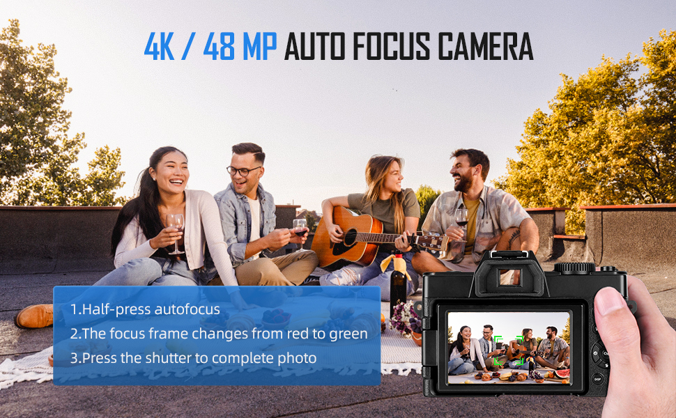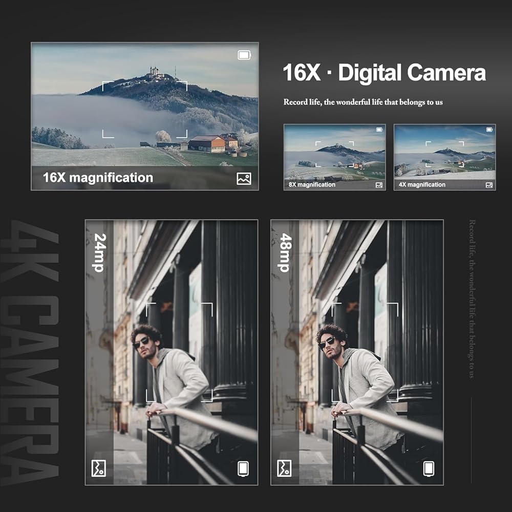 • [كاميرات AF&MF بدقة 48 ميجابكسل للتصوير الفوتوغرافي]: تحتوي هذه الكاميرا الرقمية على وظيفة التركيز التلقائي. في وضع التصوير الفوتوغرافي، اضغط برفق على زر الالتقاط للحفاظ على استقرار الكاميرا. ستركز الكاميرا تلقائيًا على هذه النقطة. علاوة على ذلك، تدعم الكاميرا الرقمية تقريب رقمي يصل إلى 16x، مما يتيح لك التقاط الأشياء البعيدة بسهولة.