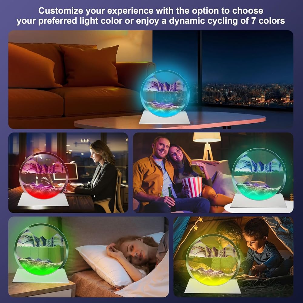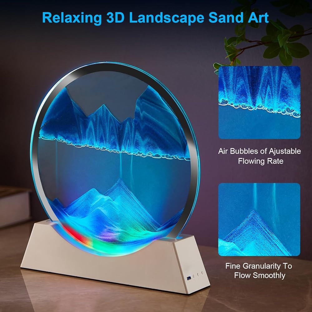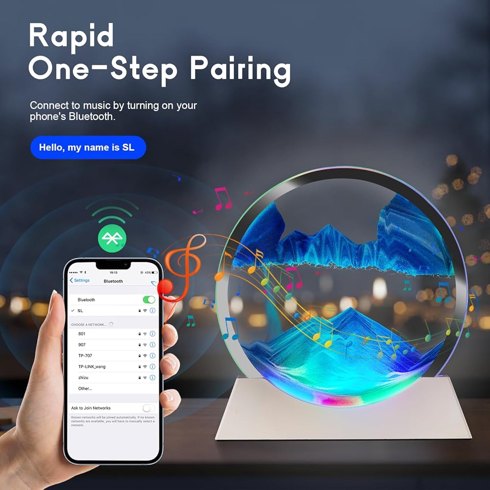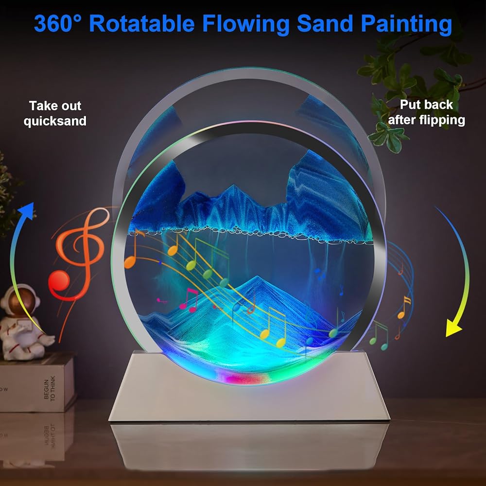 مكبر صوت بلوتوث: عزز تجربتك مع هذا الديكور الفني الرملي المتحرك الذي يتضمن قاعدة مكبر صوت بلوتوث. قم بتوصيله بسهولة بهاتفك وتشغيل الموسيقى المفضلة لديك للحصول على بيئة غامرة ومريحة تمامًا.