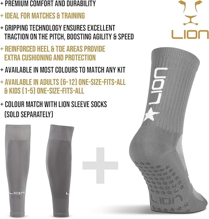 مجموعة Lion Kids لكرة القدم تتضمن جوارب للإمساك وواقيات صغيرة للساق وأكمام جورب - المجموعة المثالية للاعبي كرة القدم الشباب