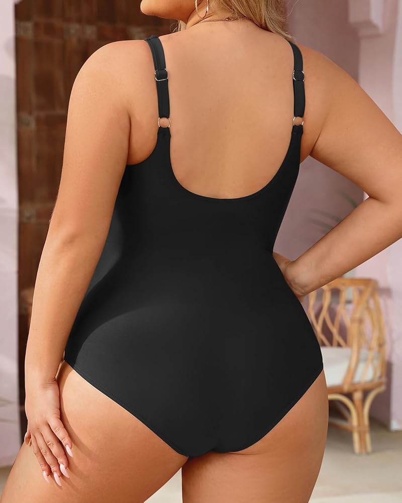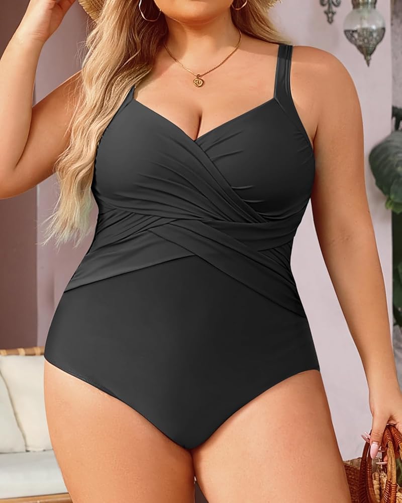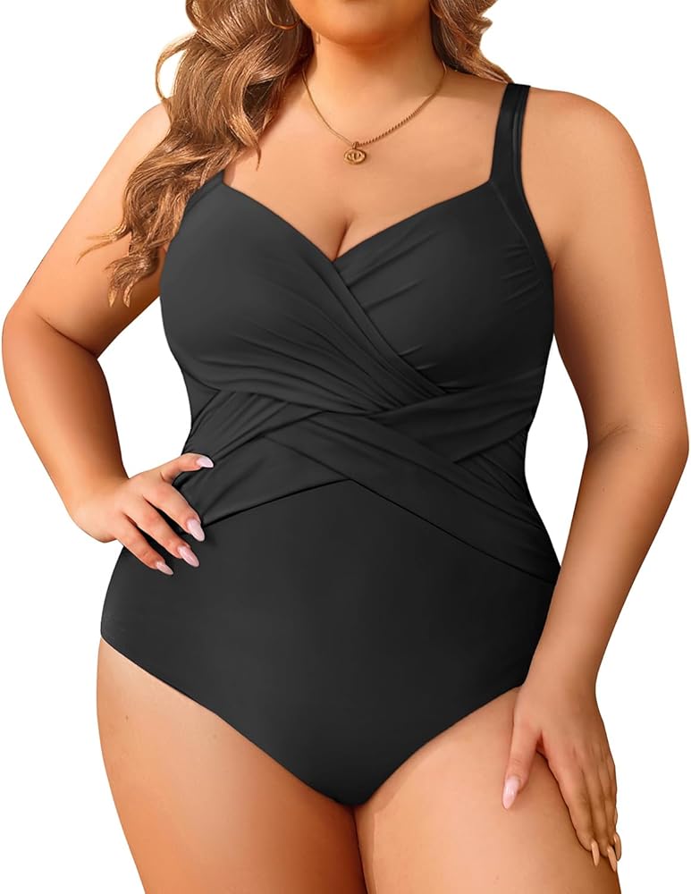 ملابس سباحة سوداء كبيرة الحجم للتحكم في البطن للنساء: تتميز ملابس السباحة هذه المصممة بأناقة بنمط متقاطع مكشكش على الجذع، والذي يخفي أي عيوب بخبرة ويخلق صورة ظلية أنحف.