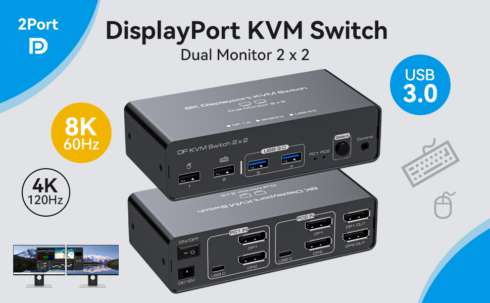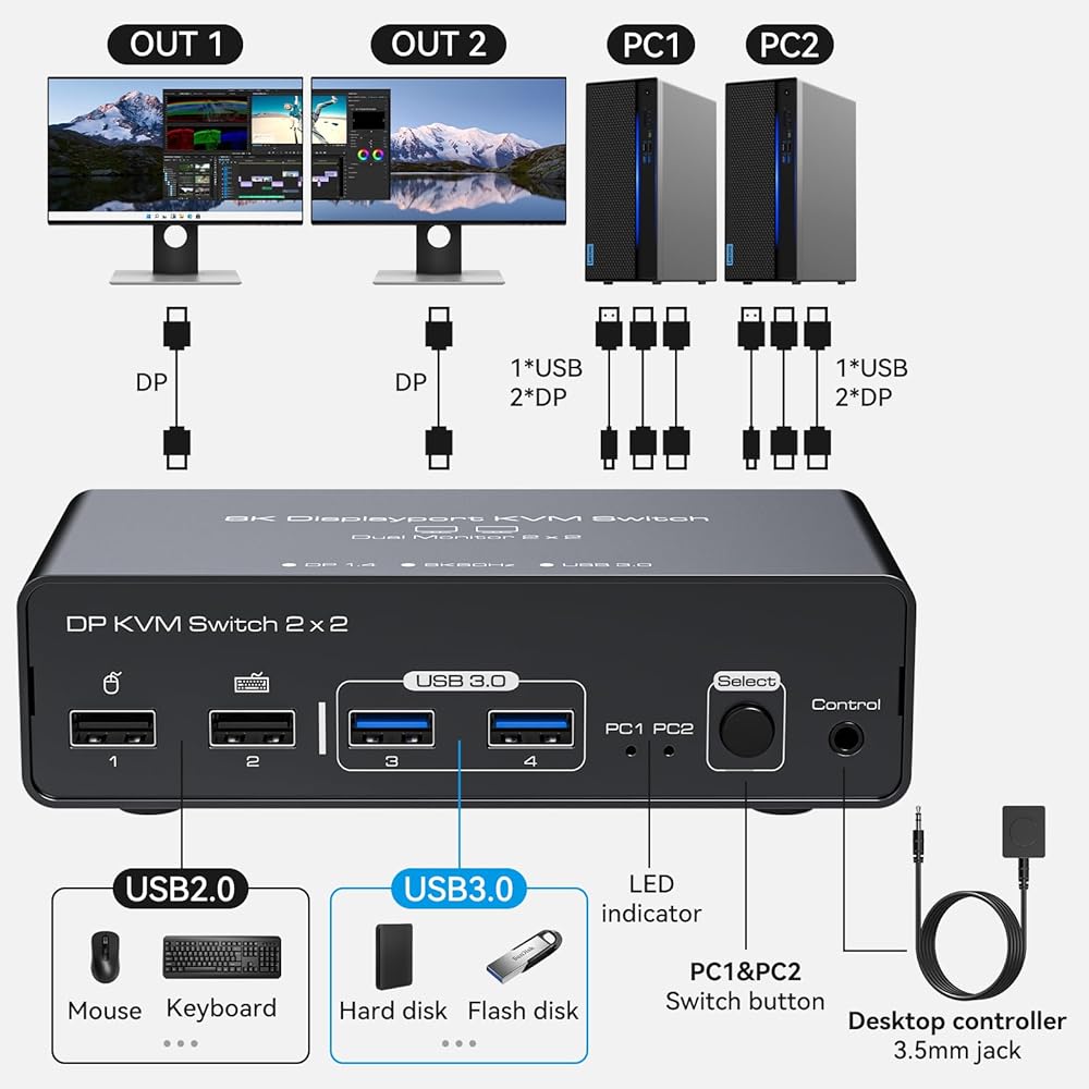 【دقة عالية الدقة 8K@60 هرتز】يدعم منفذ العرض kvm دقة مذهلة تصل إلى 8K@60 هرتز و4K@120 هرتز للحصول على جودة صورة وفيديو فائقة. كما أنه متوافق مع الدقة الشائعة مثل 4K@60 هرتز و1080P و720P. تأكد من أن المصدر وكابل DP يدعمان 8K@60 هرتز للحصول على الأداء الأمثل بأعلى دقة.