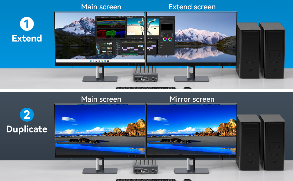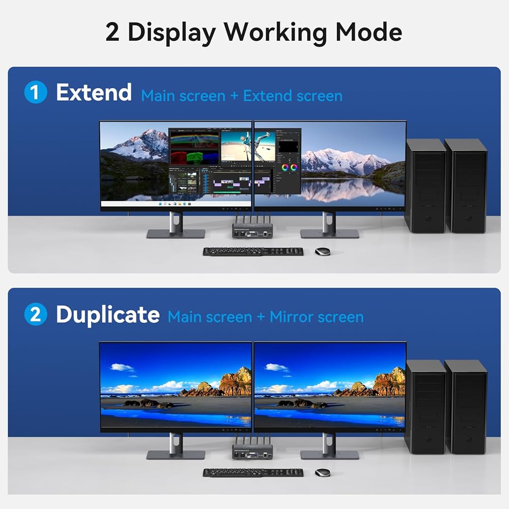 【منفذ عرض مفتاح KVM 】يسمح مفتاح KVM لجهازي كمبيوتر بمشاركة شاشتين و4 منافذ USB، بما في ذلك دعم الأجهزة مثل الفئران ولوحات المفاتيح والطابعات والأقراص الصلبة الخارجية. فهو يوفر الوضع الممتد (الذي يسمح لك بنقل نوافذ التطبيق من الشاشة الرئيسية إلى الشاشة الثانوية لزيادة كفاءة العمل) ووضع النسخ (الذي يسمح لك بعكس الصور على كلا الشاشتين). تأكد من أن مصدر الإشارة الخاص بك يدعم العرض على شاشات متعددة. ملاحظة: للإخراج إلى شاشتين، يجب توصيل منفذي DP1 وDP2 بنفس الكمبيوتر.