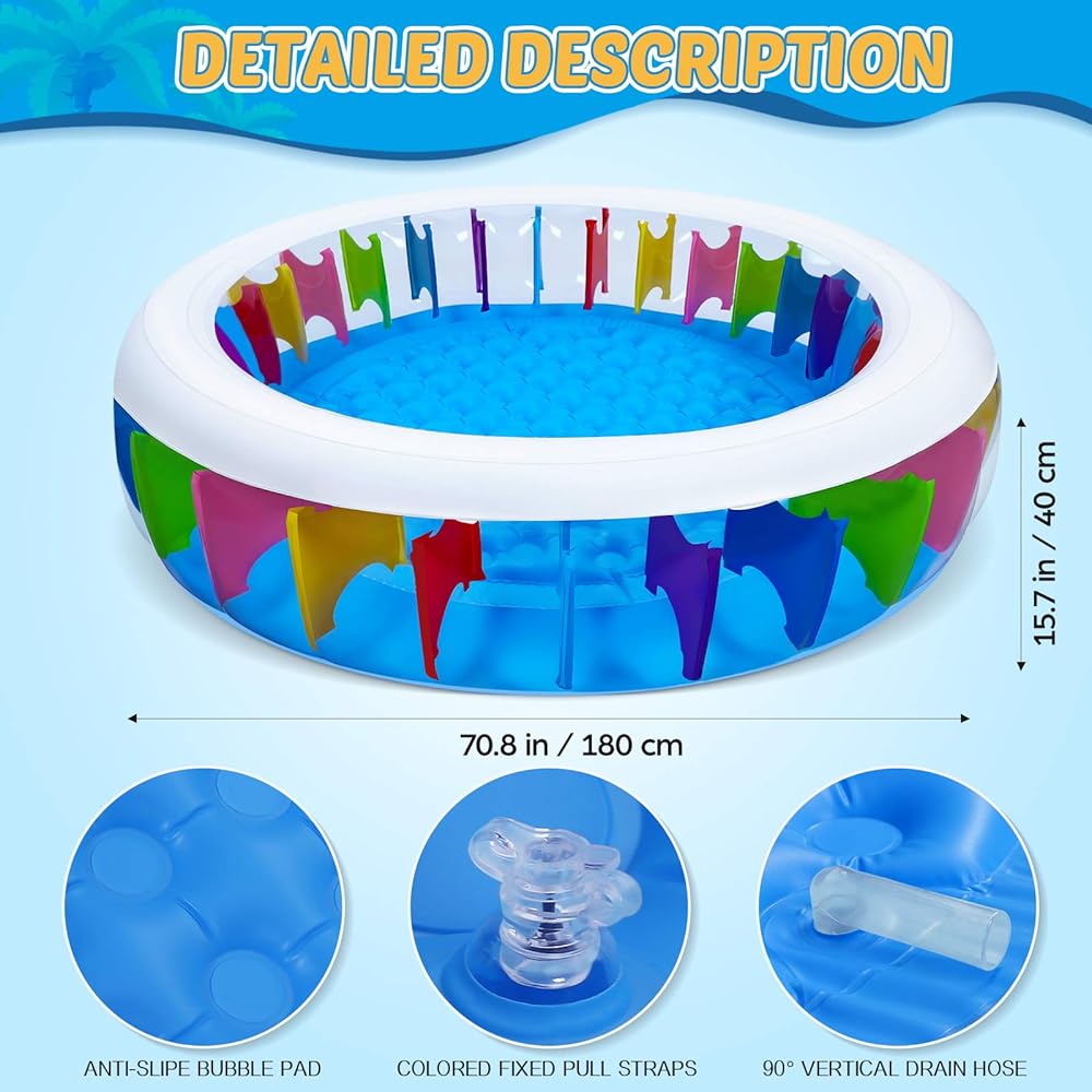 أشرطة سحب ملونة - يحتوي حمام السباحة العائلي الدائري القابل للنفخ على أشرطة سحب مدمجة بألوان مختلفة، وهو مفيد في تثبيت حمام السباحة القابل للنفخ ومنعه من الطي. وفي الوقت نفسه، فإن اللعب بالماء في بيئة ملونة يمكن أن يزيد من اهتمامهم، فضلاً عن قدرتهم على الملاحظة والتفكير والذاكرة.