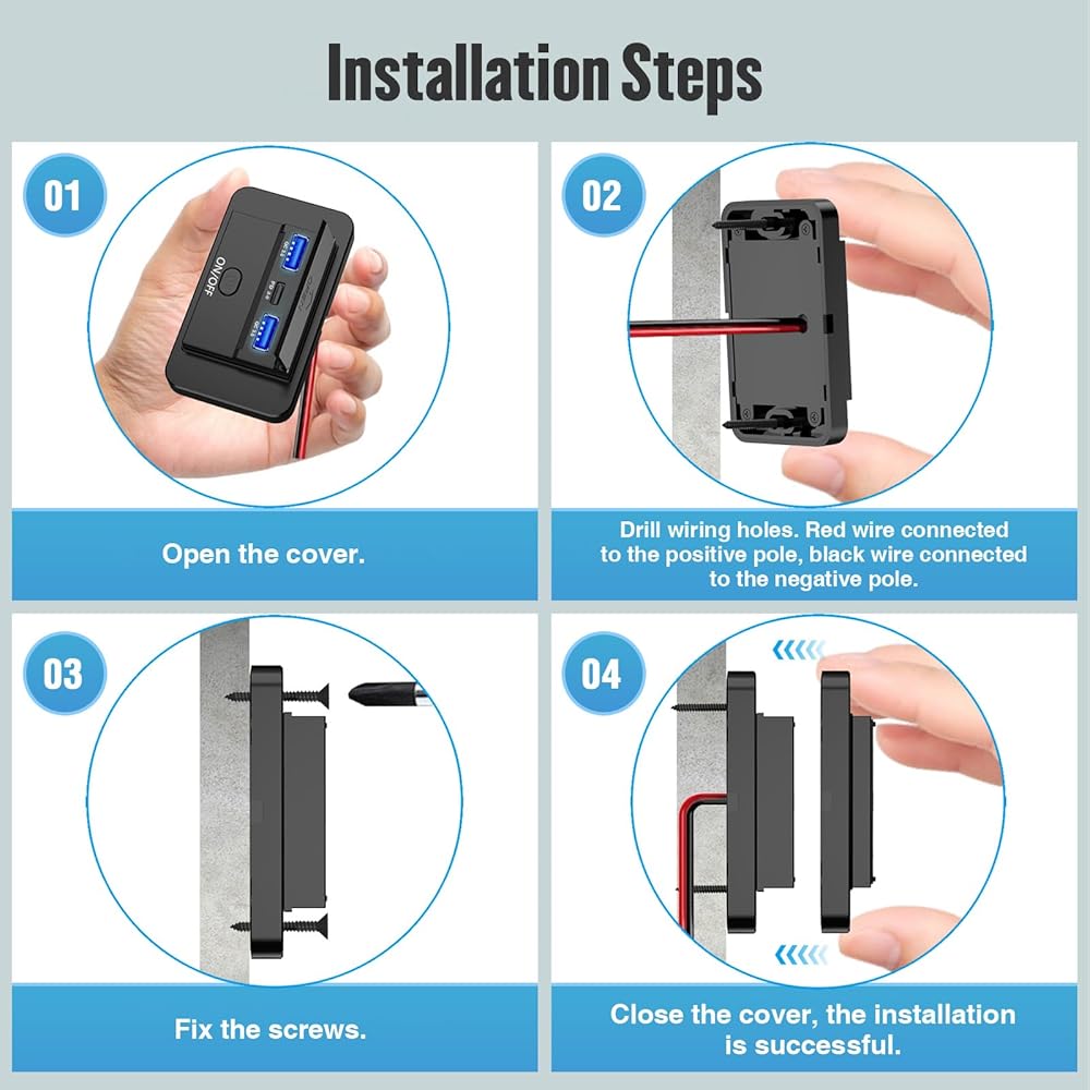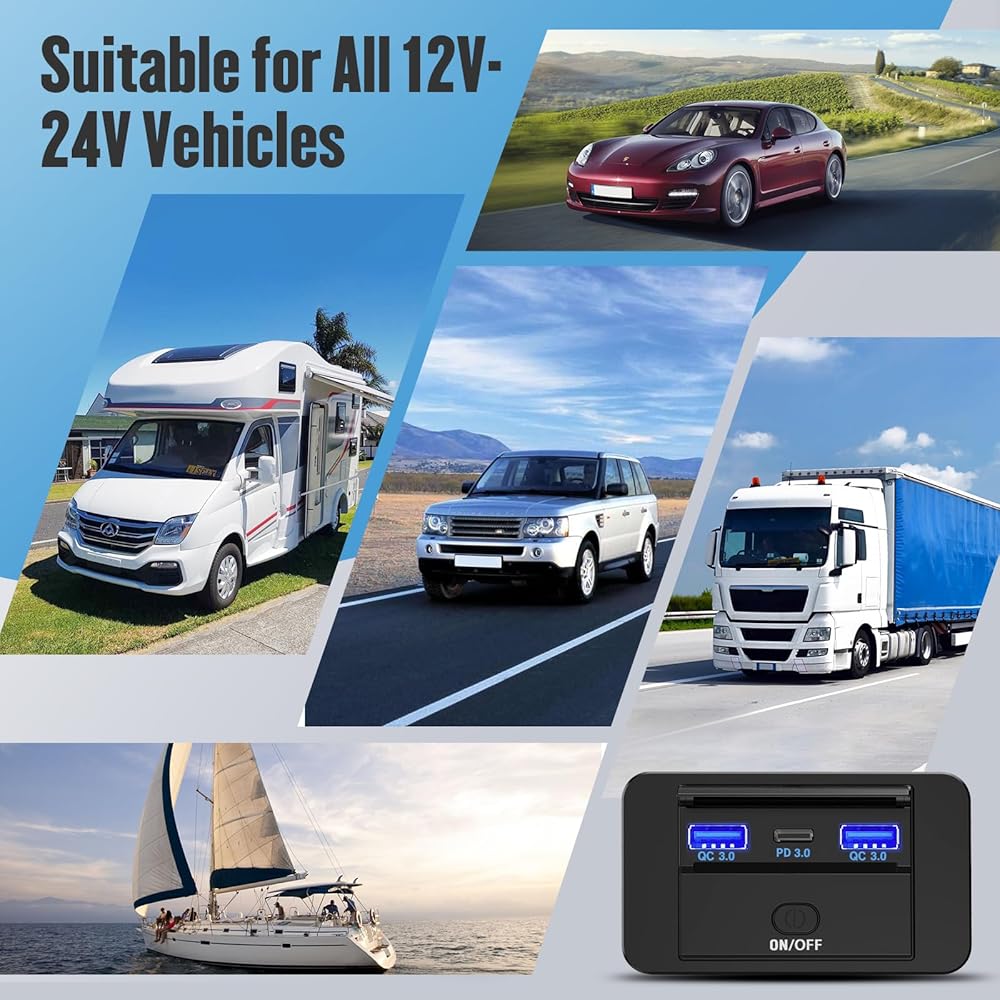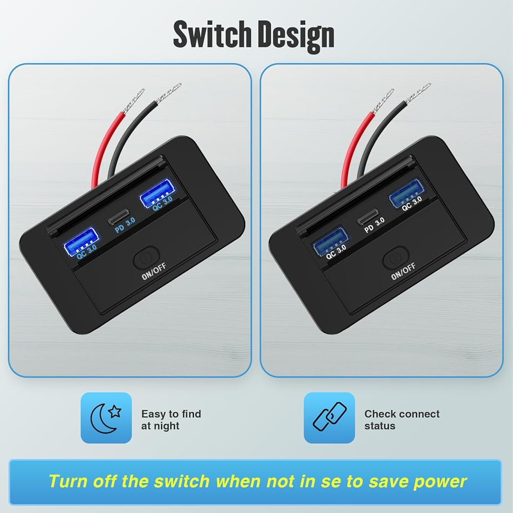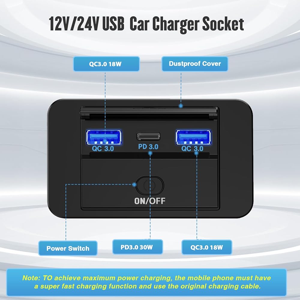 【3 in 1 Charger Socket】This charging socket panel is equipped with dual QC3.0 ports and one PD3.0 port,input voltage: 12-24V. Charge all Android and iOS devices at maximum charging speed. Note: for maximum power, the phone must have super fast charging and use the original charging cable.