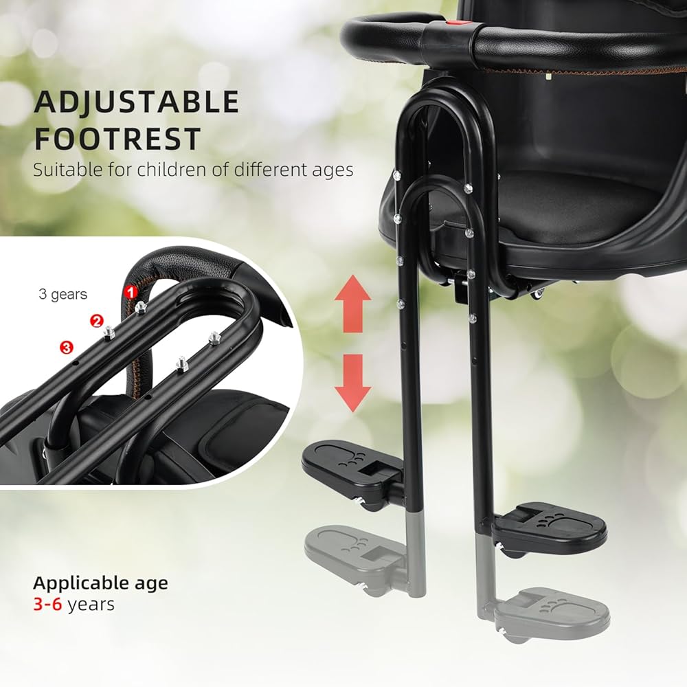 مريح: مقعد أطفال للدراجة مثبت في الأمام مع مسند قدم قابل للسحب، وفقًا لارتفاع نوع جسم الطفل، اضبط طول وزاوية العمود التليسكوبي المصنوع من الألومنيوم، من أجل تحقيق وضع الجلوس الأكثر راحة للأطفال.