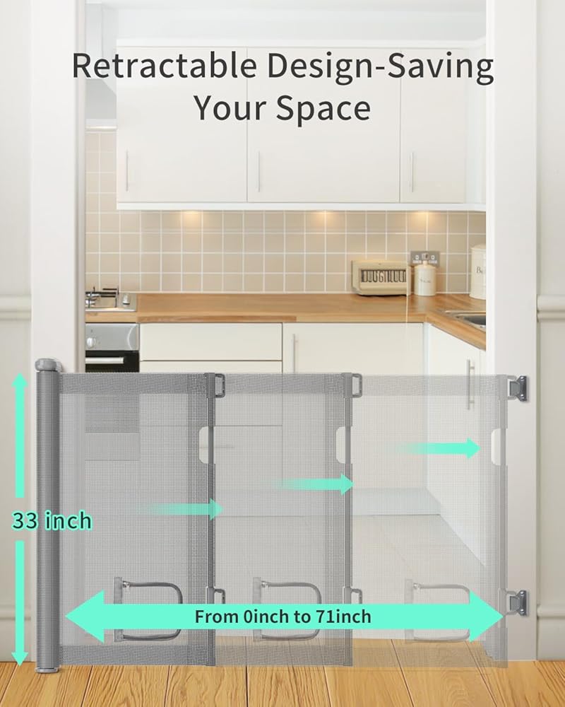 【تصميم قابل للسحب وقابل للتعديل】تمتد بوابة الأطفال متعددة الاستخدامات من 0 إلى 71 بوصة عرضًا ويبلغ ارتفاعها 33 بوصة، وهي مثالية لمختلف المداخل. عند عدم الاستخدام، يمكن طيها لتوفير المساحة. مع عدم وجود قضبان سفلية، يمكنك توديع مخاطر التعثر.