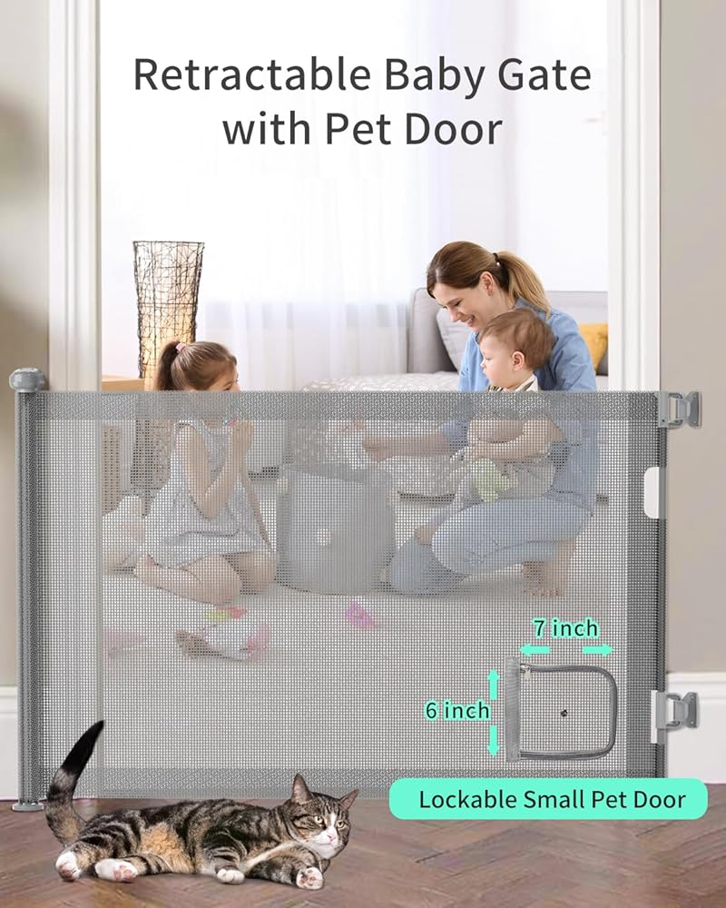 بوابة أطفال قابلة للسحب مع باب للقطط، بوابة للحيوانات الأليفة مع باب - تمتد إلى 71 بوصة عرضًا، وبوابة كلب طويلة 33 بوصة للسلالم، بوابة أطفال شبكية مع باب للقطط/الكلاب الصغيرة، سهلة التركيب للمداخل، في الداخل والخارج