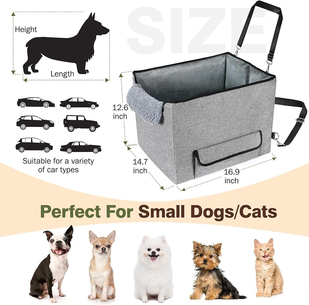 🚗【مقعد معزز للكلاب متعدد الوظائف】أبعاد مقعد سيارة الكلاب لدينا هي 16.9 بوصة * 14.5 بوصة * 12.5 بوصة، والتي يمكنها حمل معظم الكلاب الصغيرة، مثل البلدغ الفرنسي، والشيواوا، واليوركشاير، والبوميرانيان، وما إلى ذلك. يمكن أيضًا استخدام مقعد السيارة المحمول للكلاب كسرير سيارة للكلاب، أو سرير للكلاب في المنزل، أو سرير للكلاب للتخييم في الهواء الطلق.