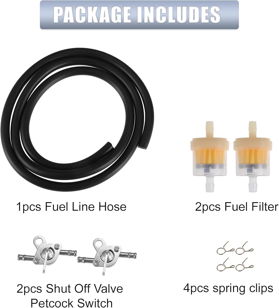 تتضمن الحزمة: 1 قطعة خرطوم خط الوقود، 2 قطعة مرشحات الوقود، 4 قطعة مشابك زنبركية، 2 قطعة صمام بيتكوك.