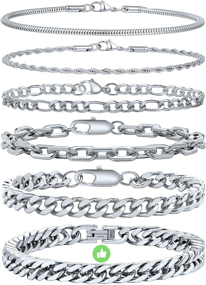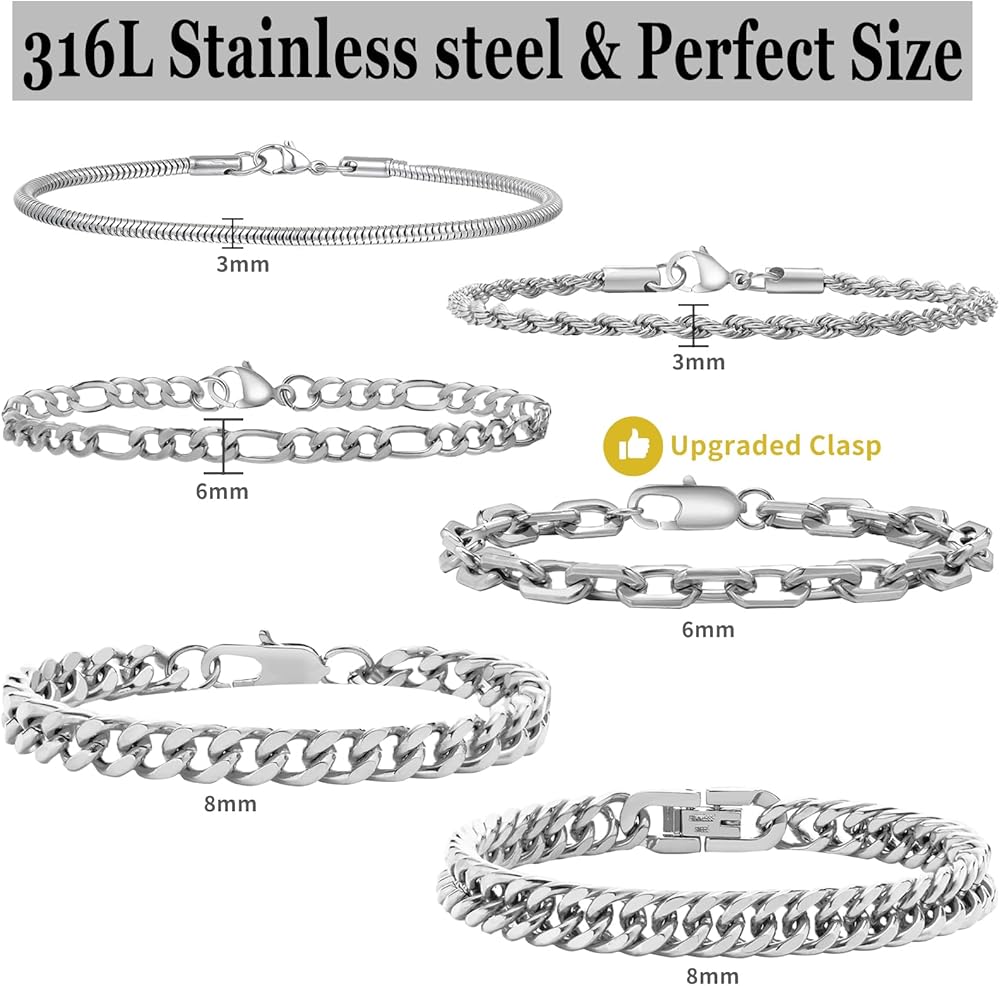 【مجموعة هدايا مثالية】تأتي مع 6 أساور إجمالاً (سلسلة حبل، سلسلة مشبك ورق، سلسلة فيجارو، سلسلة ثعبان، و2 سوار من سلسلة ربط كوبي) 【صندوق شفاف】للهدايا والجمع.