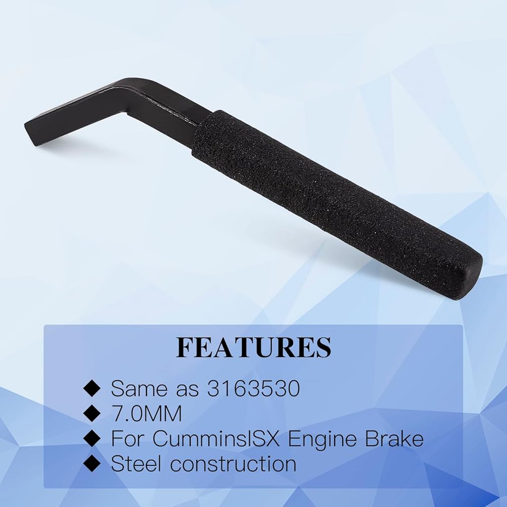 Used to set the gear train timing for single or double camshaft Cummins engines. Insert the brake tool between the slave pistons contact surface with the exhaust valve adjusting screw to adjust screws on each cylinder.Replace part number: 3163020 Crank Pin, 3163021 Cam Timing Tools, 3163069 Cam Gear Puller, 3163530 Engine Brake Adjustment Tool 7MM.