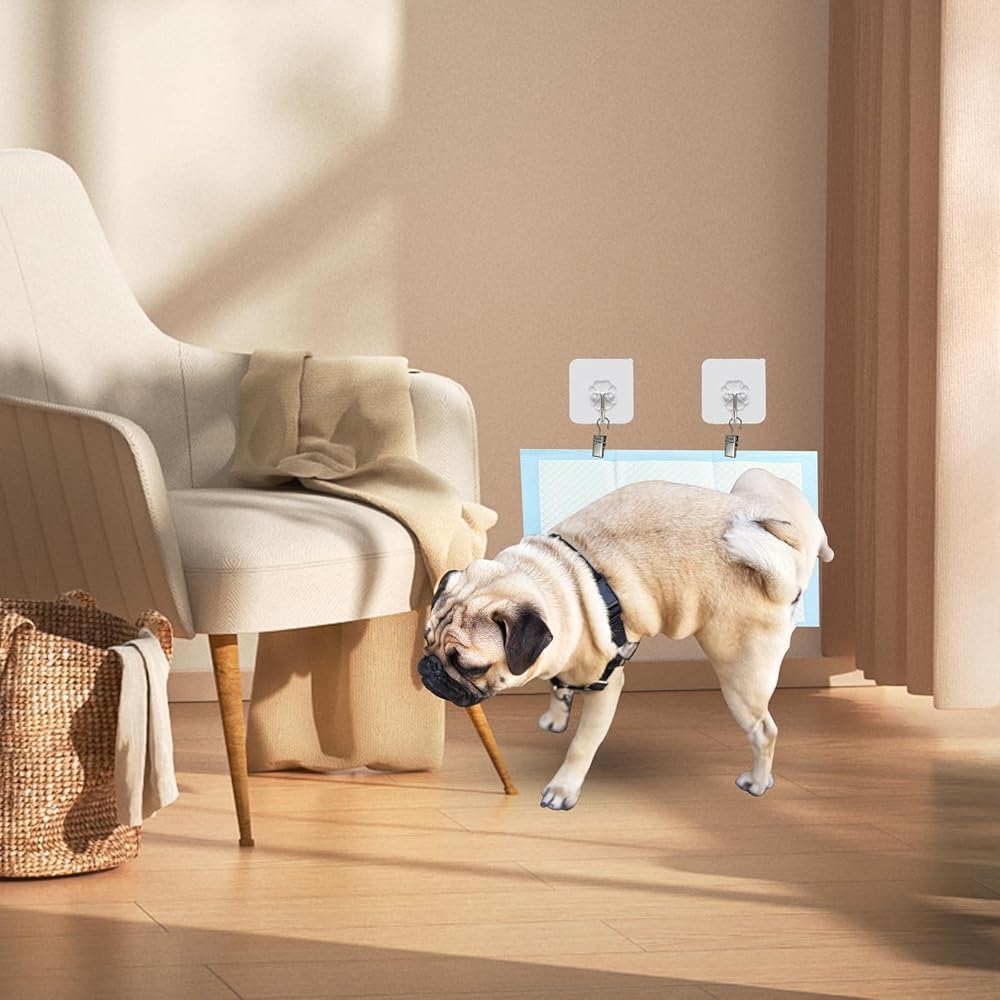 • Holds any size pee pads. The holder comes with 8 pieces of adhesive hooks and clips, which can be used to secure pee pads of any size. This makes it a versatile option for dogs of all sizes.