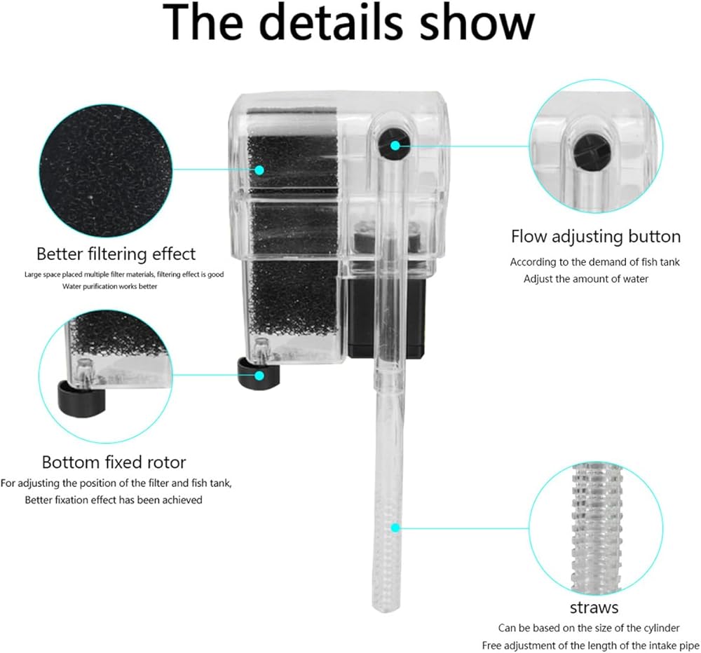 Hang-in filter: three-in-one function, fish tank filtration, fish tank oxygenation and good viewing.