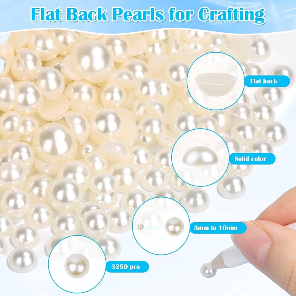 • 【Flat Back Pearls for Crafting】This flat pearl beads kit includes 3 boxes of imitation round half pearls in 6 sizes(3mm, 4mm, 5mm, 6mm, 8mm, 10mm), enough quantity and assorted sizes to meet your different craft, makeup, nail art projects. With Smooth Surface on the back, you can use pearl bead glue to stick pearl nail gems on any smooth surface.