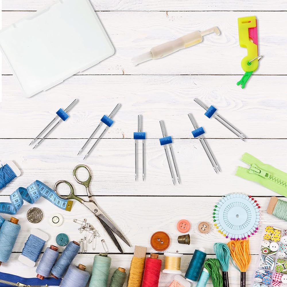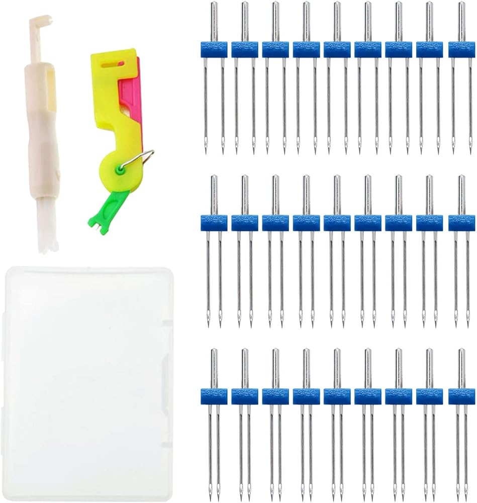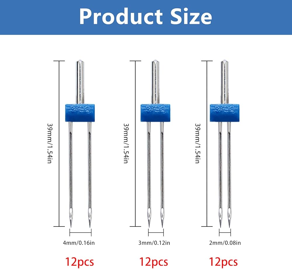 Abundant quantity: each package comes with 36 pieces of twin needles pins with plastic box and 1 piece of automatic needle threader, the twin needles are in 3 different size, 2.0/90, 3.0/90 and 4.0/90, 12 pieces for each size