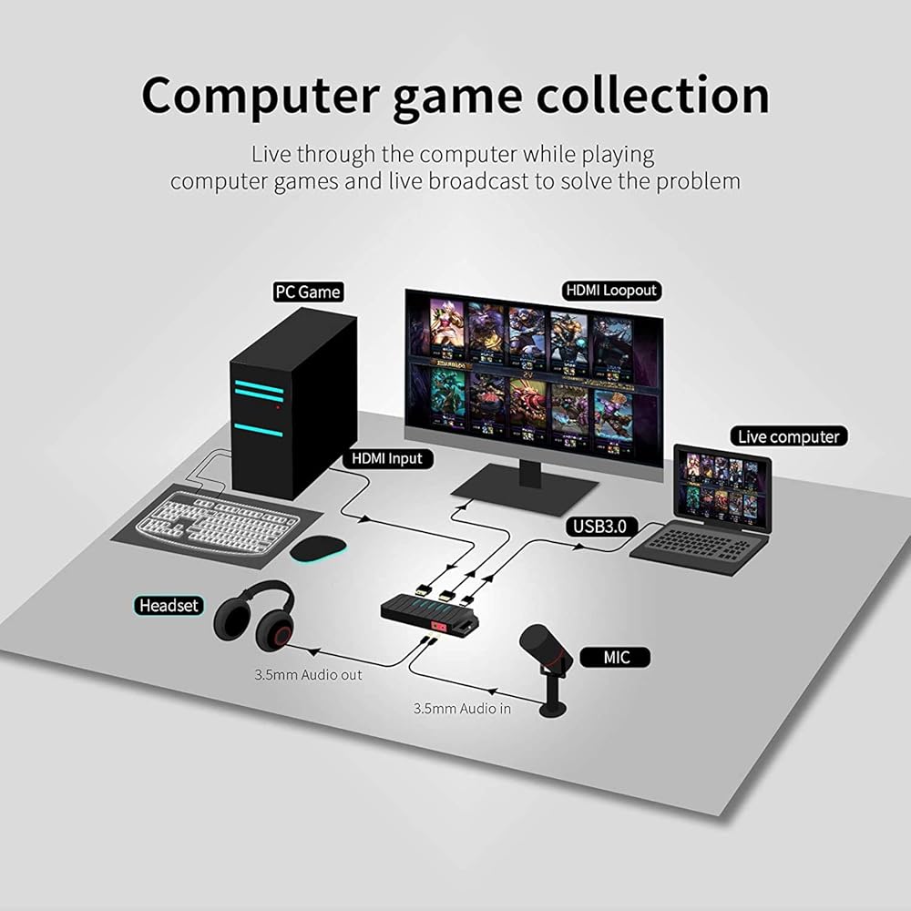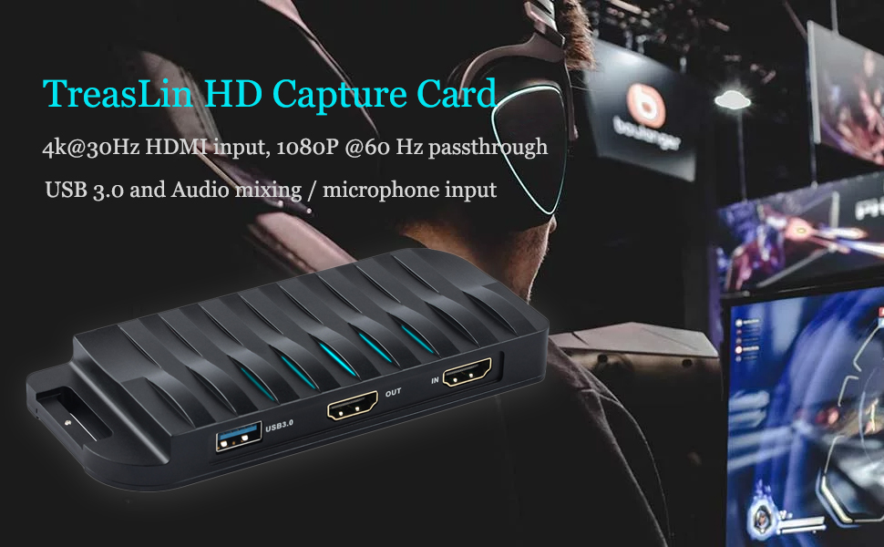 بطاقة التقاط ألعاب TreasLin HDMI، بطاقة التقاط فيديو 4K، USB3.0 HDMI Live Stream مع مدخل Mic Remix وممر HDMI لجهاز PS3/ PS4 Xbox Wii u متوافق مع Windows وLinux وmacOS وOBS