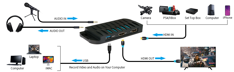 توافق أقوى: يمكن أن تتوافق بطاقة الالتقاط مع جميع أجهزة hdmi 1080P 720P، مثل PS4، PS3، Wii U، Xbox One، Xbox 360، Wii، Switch، DVD، الكاميرا، كاميرا الأمان ZOSI، DSLR وصندوق الاستقبال وما إلى ذلك. .