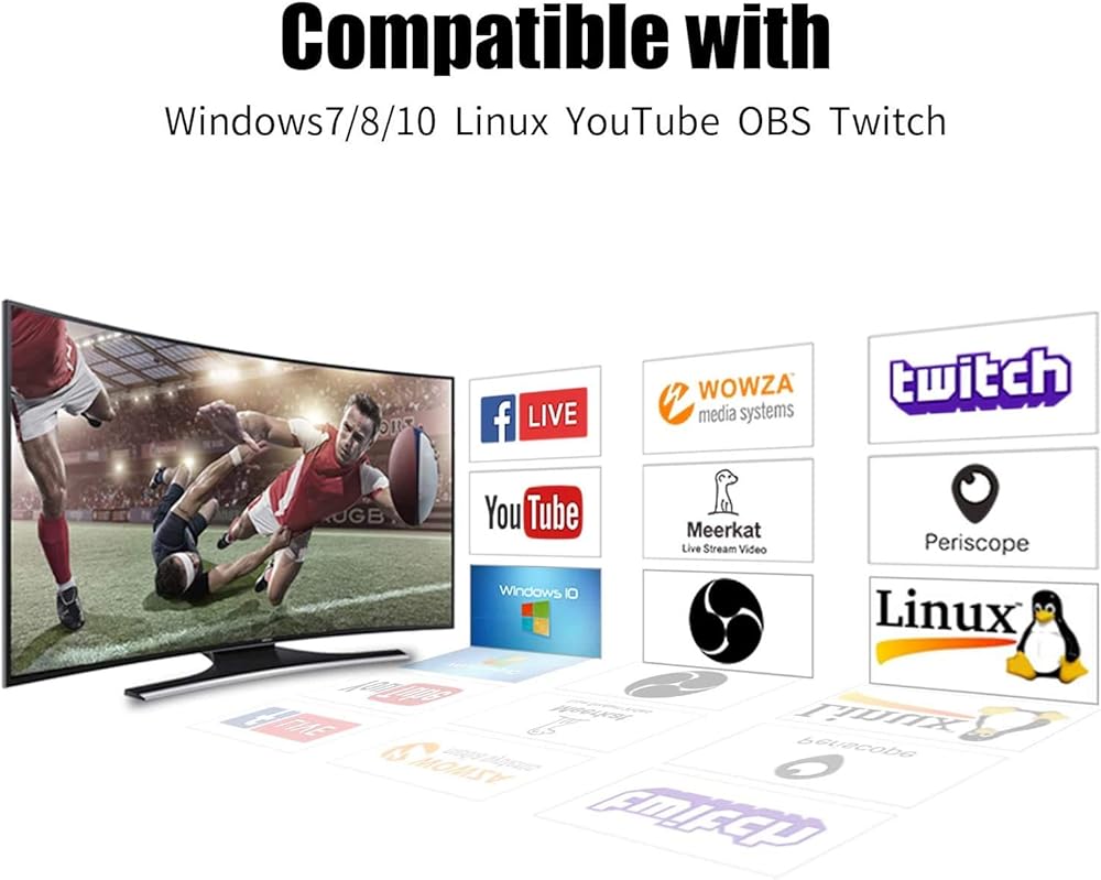 【بطاقة التقاط 4K@30HZ 】تدعم إدخال مصدر HDMI 4K@30HZ إلى بطاقة الالتقاط، مع مرور HDMI 1080P للشاشة. دعم برامج التعليق المباشر OBS، PotPlayer، Twitch، Youtube، OBS، Potplayer وVLC