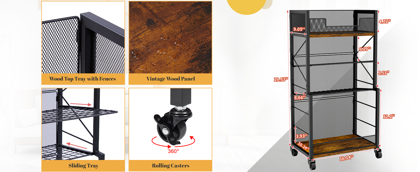 • 【الحديد والخشب】عربة الأدوات مصنوعة من معدن عالي الجودة وألواح خشبية عتيقة، والإطار المعدني يتمتع بقدرة تحمل أقوى وأسهل في وضع الأشياء الثقيلة. الألواح الخشبية ناعمة ومقاومة للماء، مع سياج شبكي حول الألواح لمنع سقوط الأشياء. يوفر المظهر العتيق والتصميم الأنيق مساحة تخزين عملية مع كونه أفضل ديكور أيضًا.