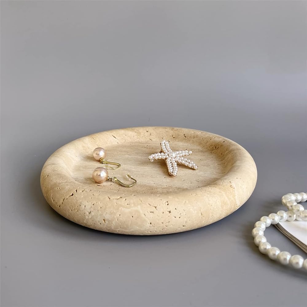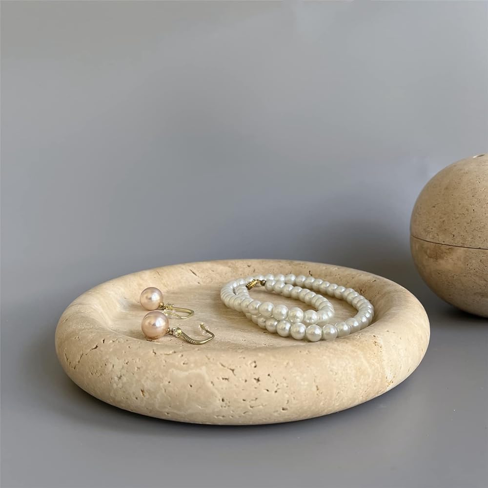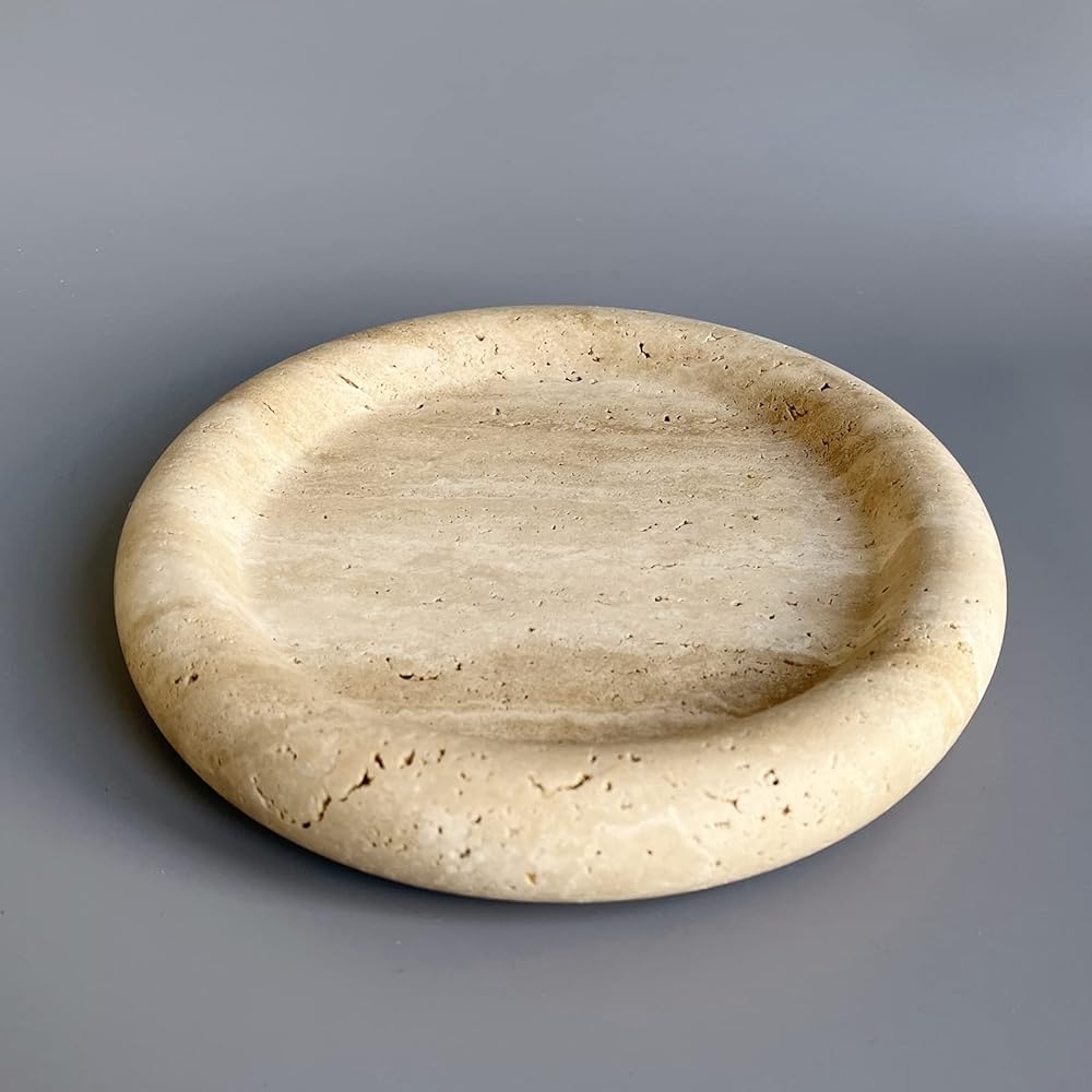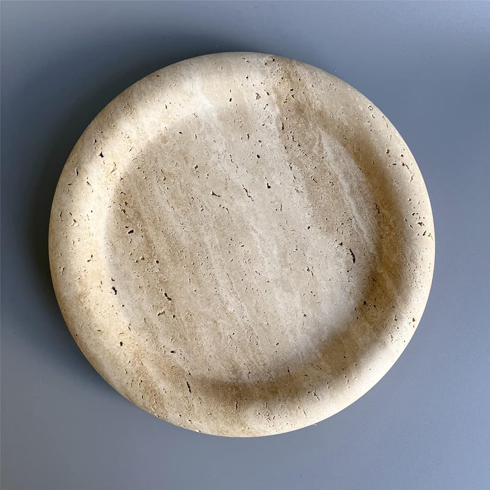 صينية مكياج مستديرة من الرخام الطبيعي من SAIDKOCC، صينية مكياج لطاولة القهوة، والحمام، وغرفة النوم (حجر جيري بيج)