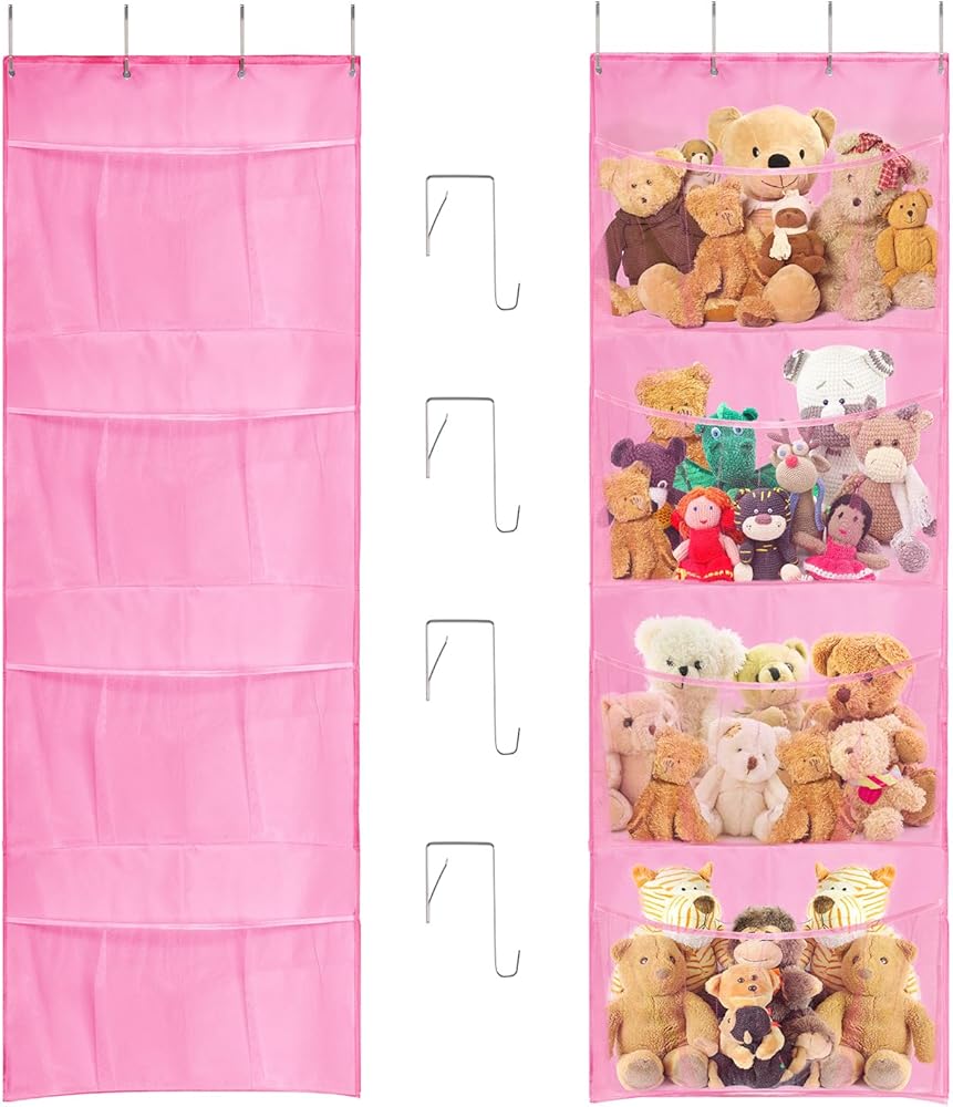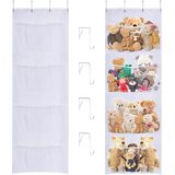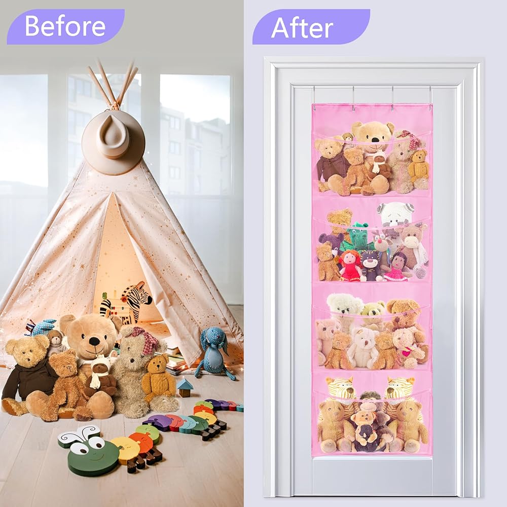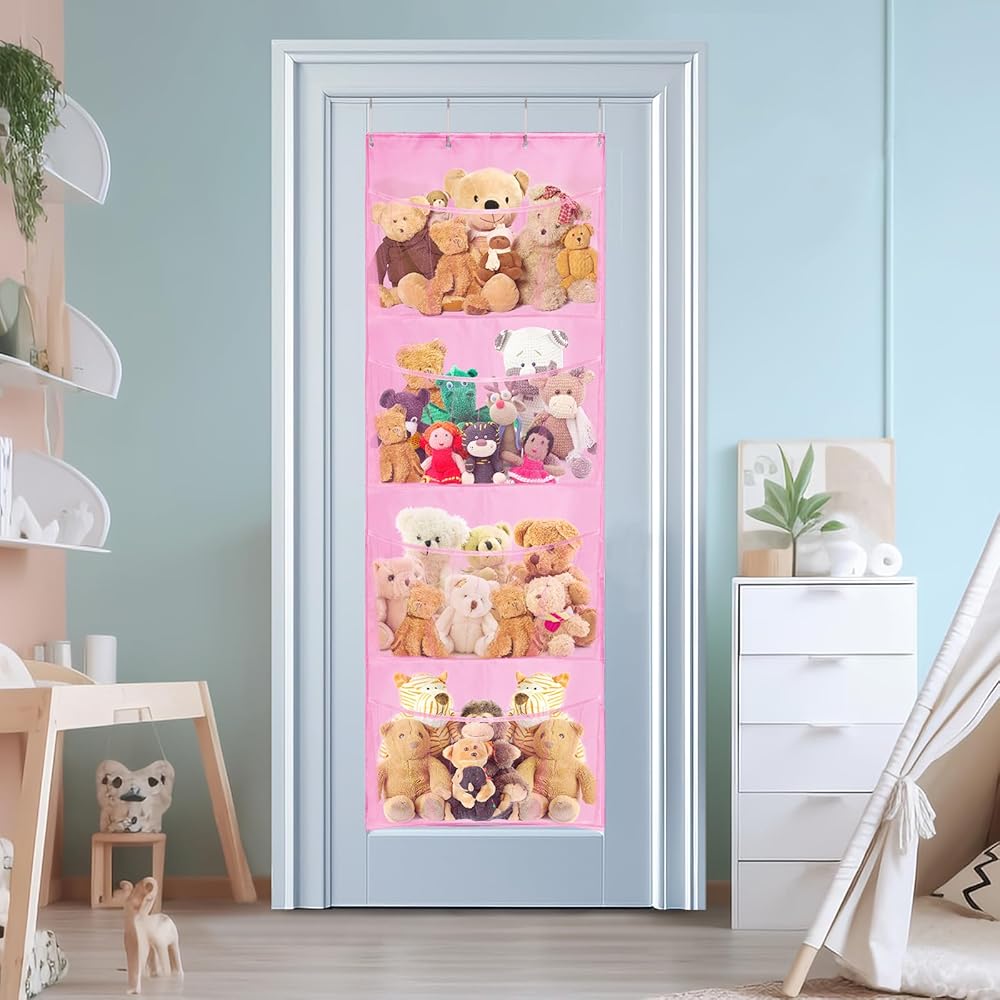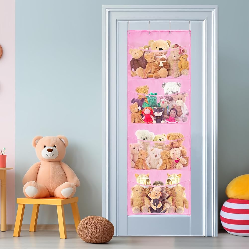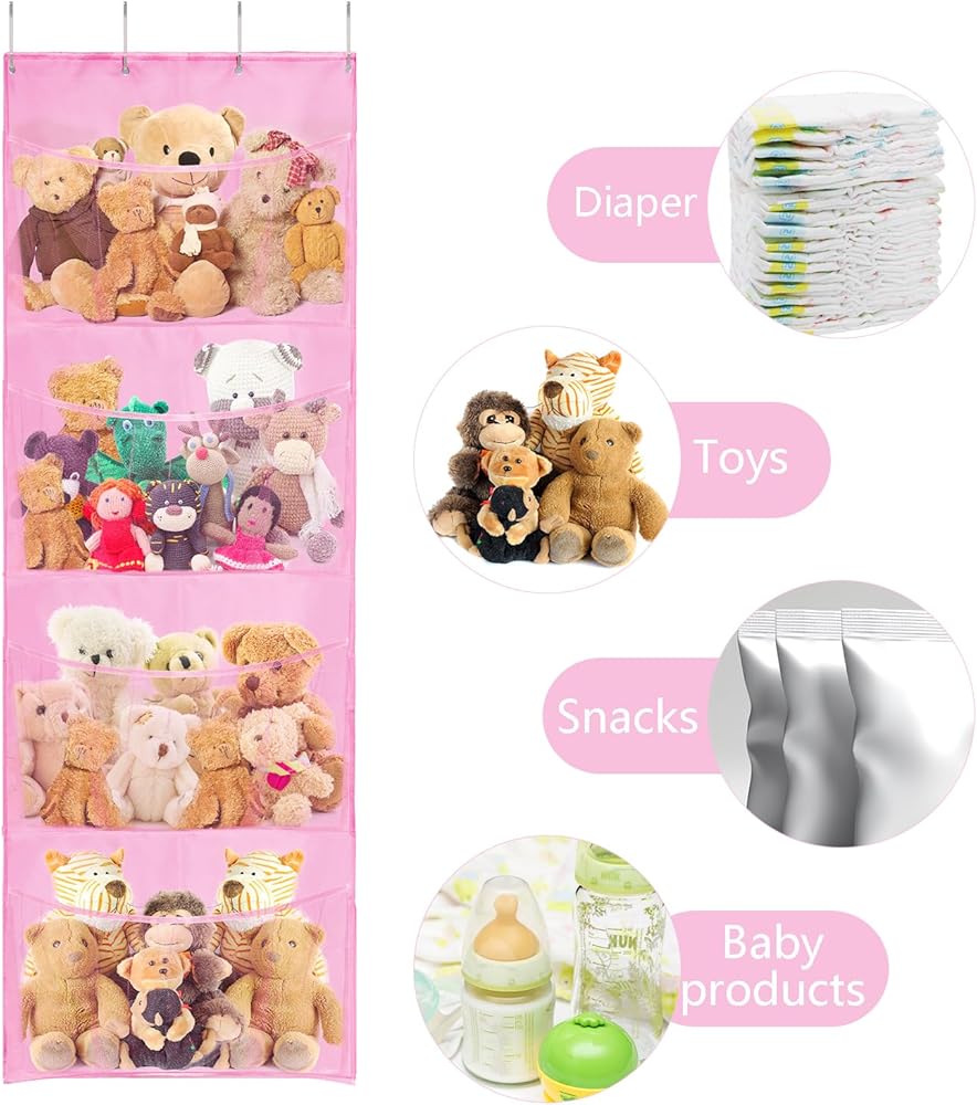 Space saving: Stuff animal organizer keeps plush animals, toys, giant toys, plush pet toys, and plush animals away from the floor. You can store temporarily unused toys in the bathroom, bedroom, laundry door, closet, and wall. This will save you space, make your room look clean and tidy, and bring you a wonderful feeling.