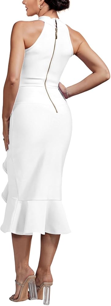 Features: Elegant party dress features a halter neck, ruffle, mermaid hem, mid-knee length, and side slit with ruffle trimming. Midi party dresses, bodycon dresses, fitted dresses for women, formal dresses for women.