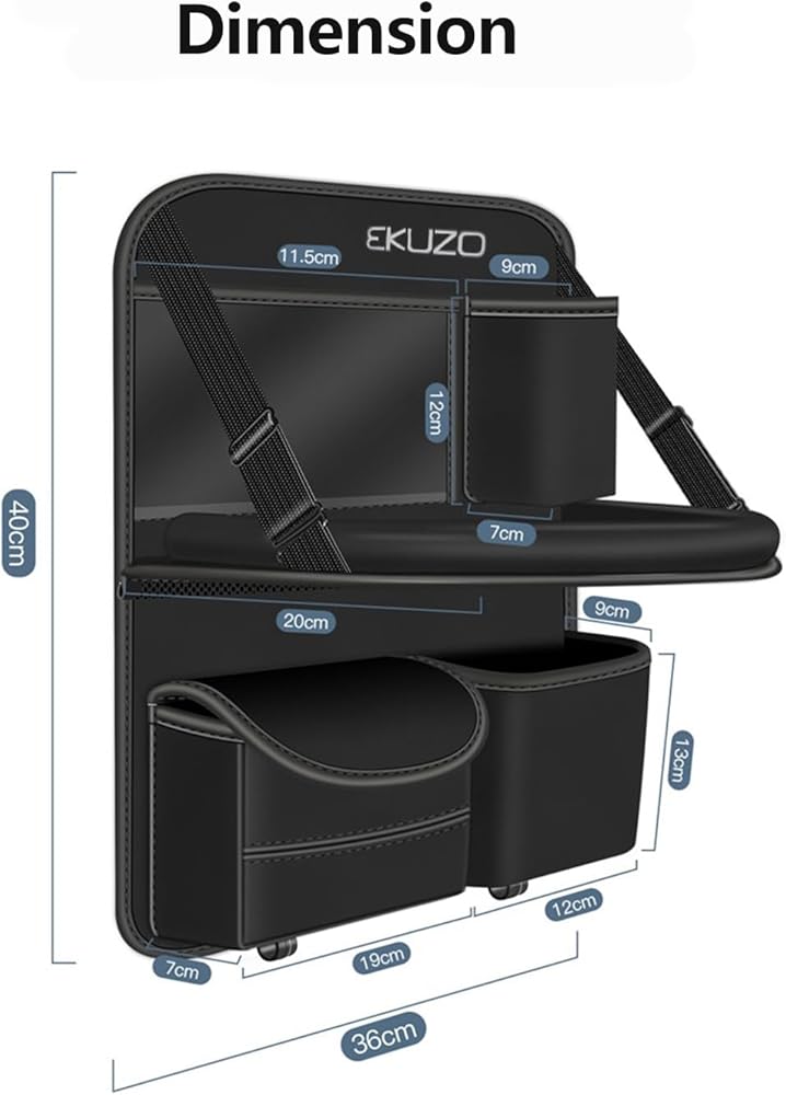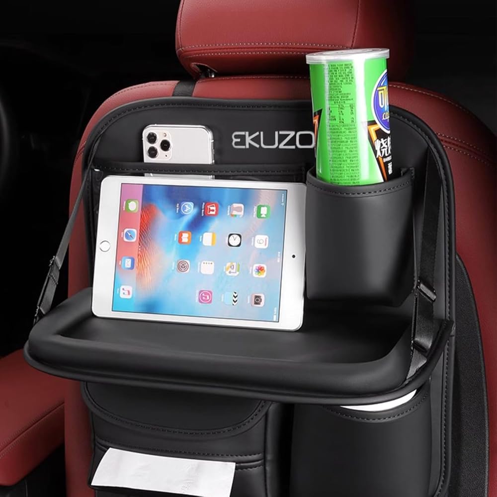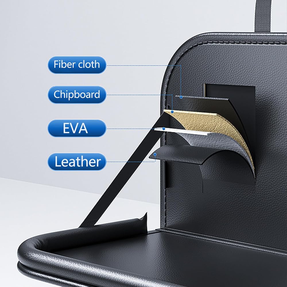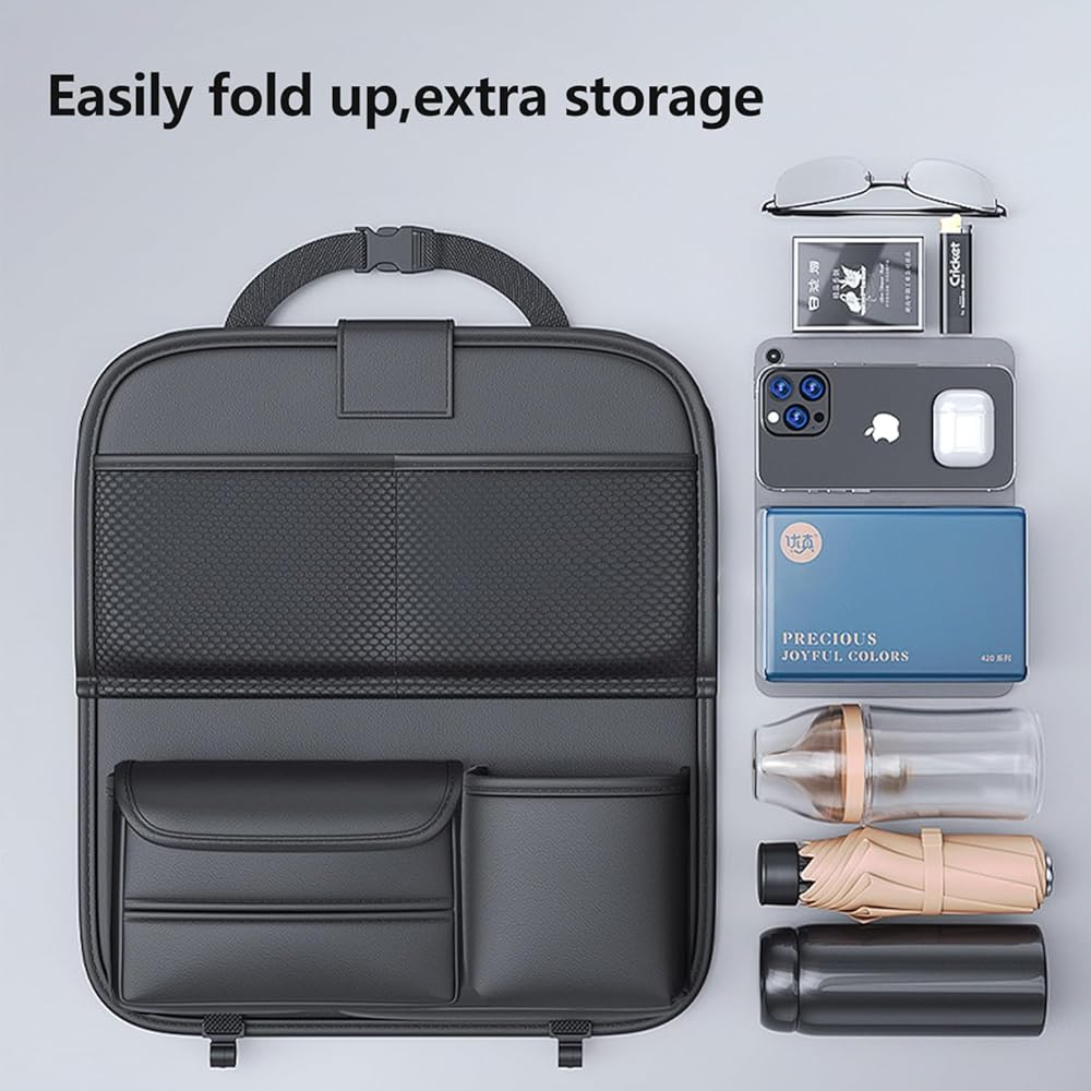 منظم المقعد الخلفي للسيارة مع صينية، طاولة سيارة قابلة للطي لمسند رأس المقعد الخلفي مع جيوب كبيرة جلد مقاوم للماء (أسود)
