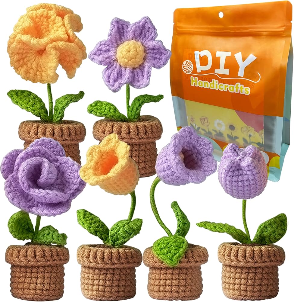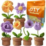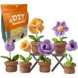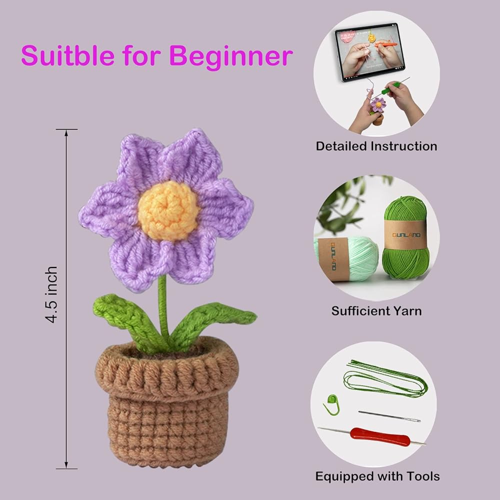 طقم كروشيه جديد للمبتدئين من كونلاند، طقم مكون من 6 قطع من الزهور بوعاء للبالغين والأطفال، طقم حياكة كروشيه للمبتدئين مع تعليمات خطوة بخطوة ودروس فيديو (بنفسجي)