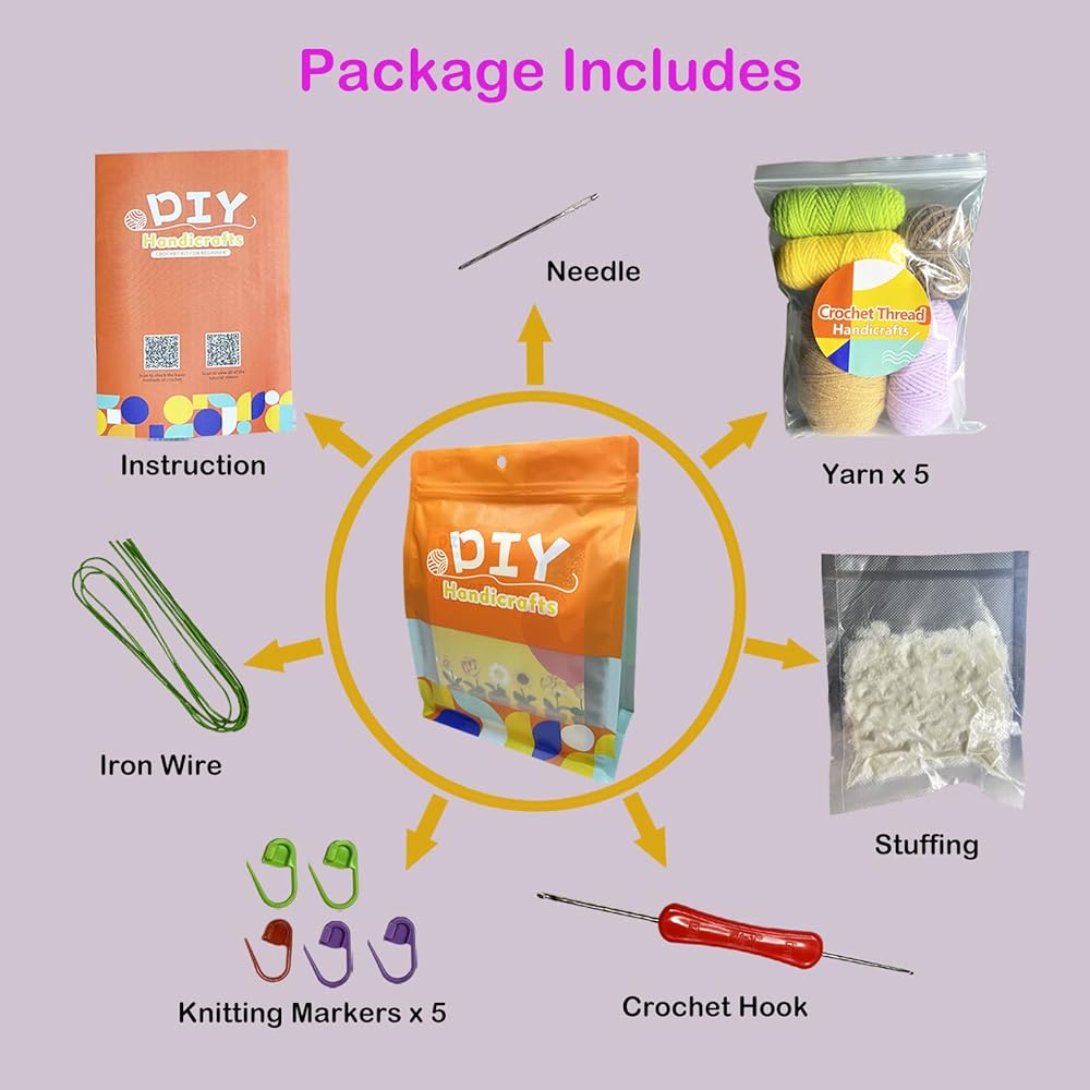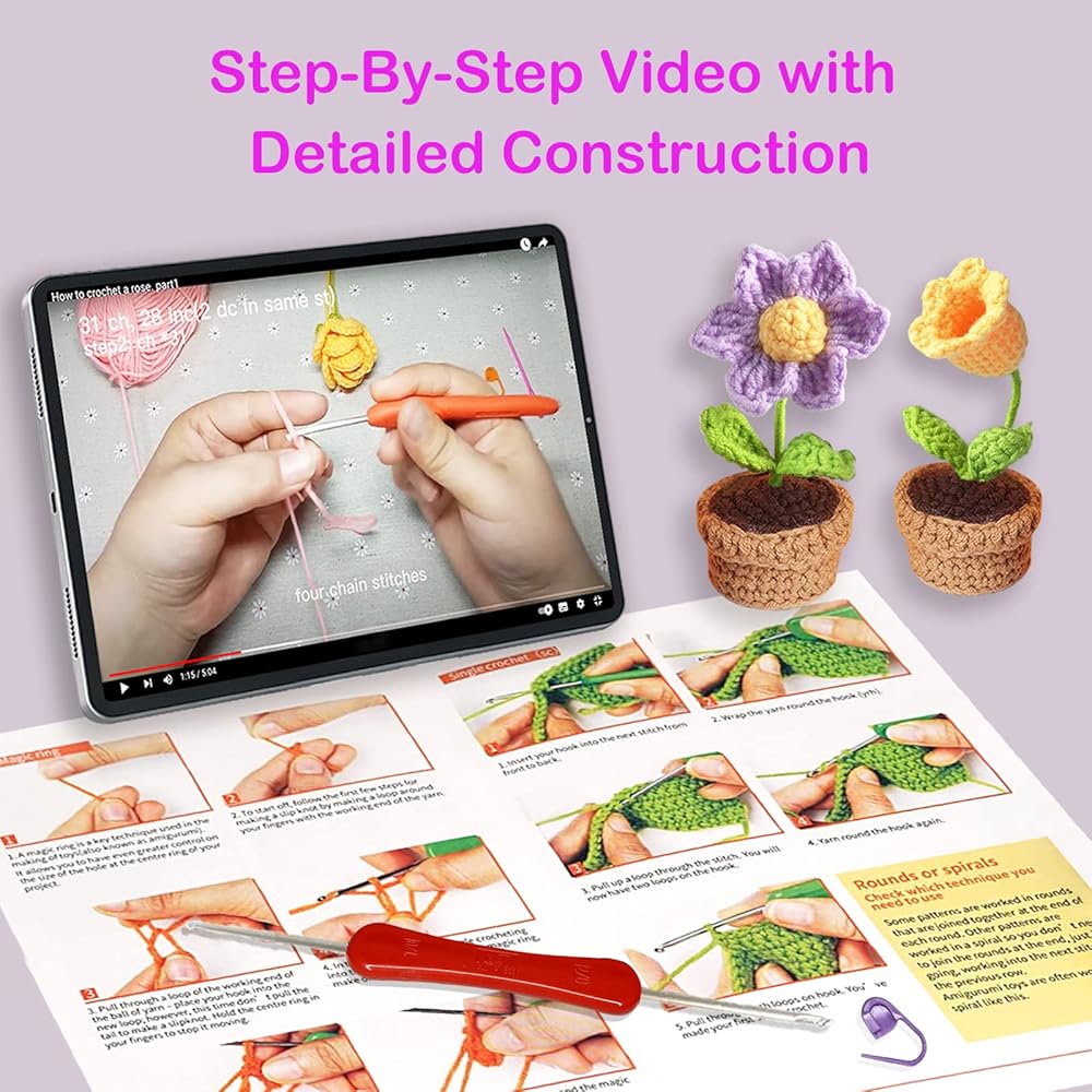 【مجموعة كروشيه كاملة للمبتدئين】تتضمن مجموعة الكروشيه الخاصة بنا كل ما تحتاجه للبدء في رحلة الكروشيه الخاصة بك. كاملة مع 5 خيوط قطنية، 1 خطاف كروشيه مزدوج الأطراف، 5 علامات غرز، 3 أسلاك حديدية، 2 تعليمات، 1 إبرة، حشو ألياف، ودروس فيديو، تحتوي هذه المجموعة على جميع الأدوات والمواد اللازمة لإنشاء 6 نباتات رائعة مختلفة.
