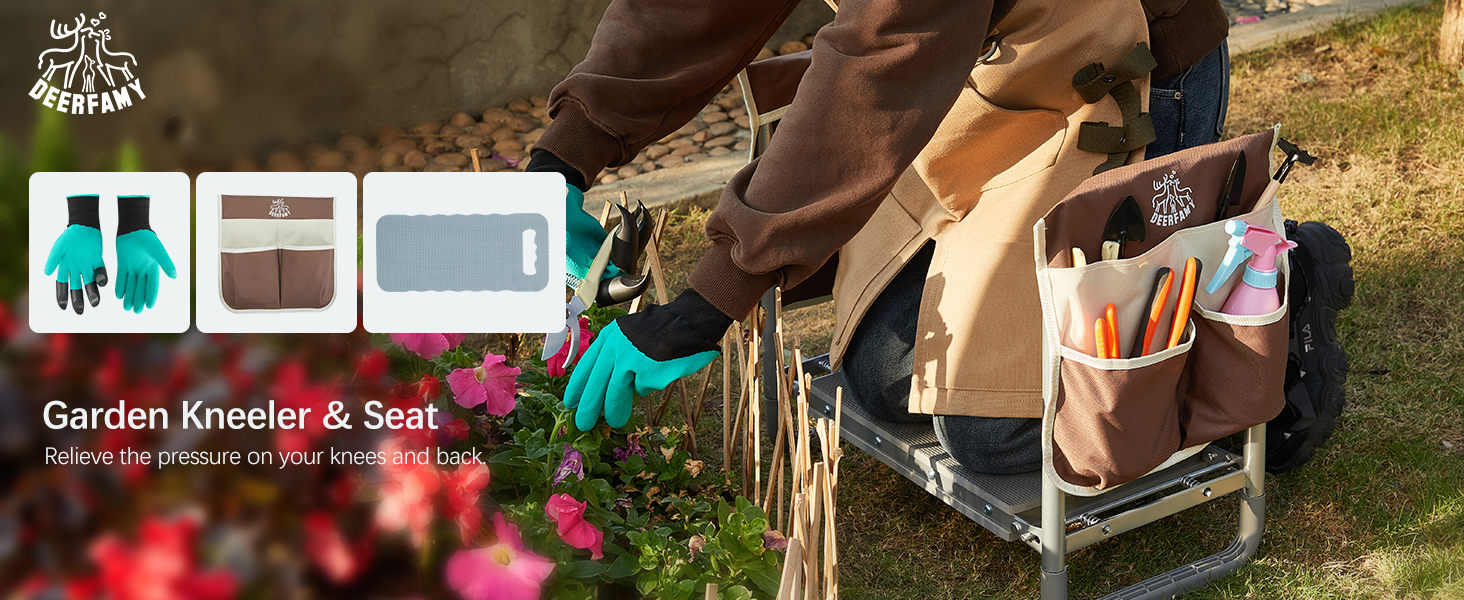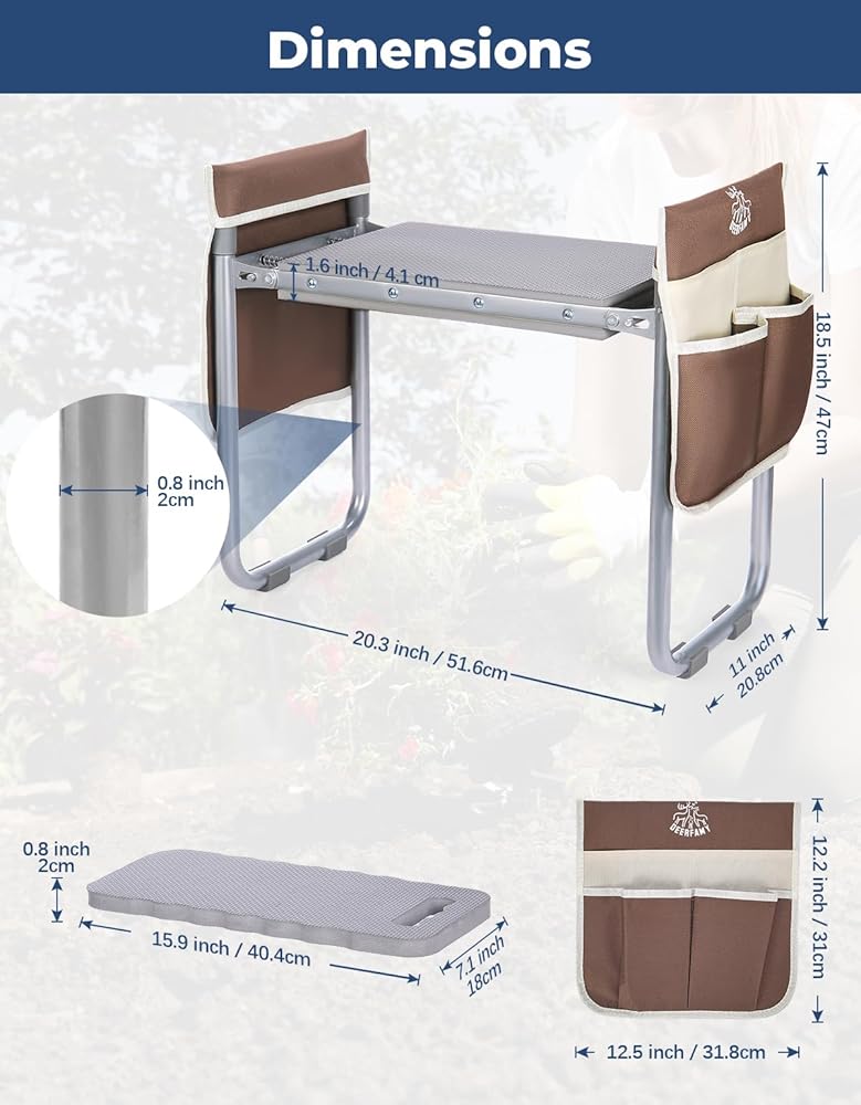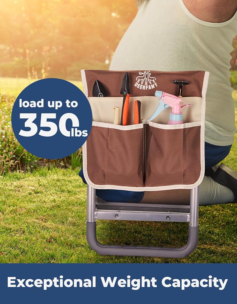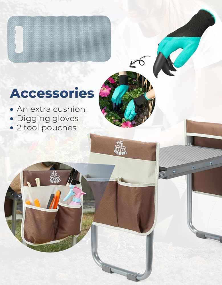 ديرفامي مقعد حديقة بعرض 10.2 انش، مقعد حديقة وغطاء تحميل للمقعد 350 باوند، مقعد بستنة شديد التحمل مع وسادة ركبة اضافية، 2 كيس للادوات، قفازات مخلبية، هدية للنساء وكبار السن، بني