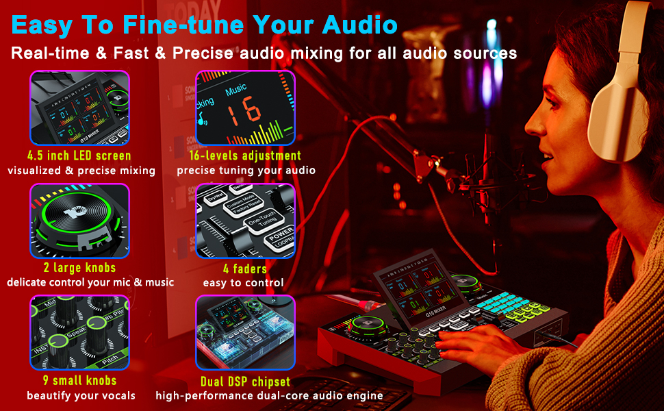 【شاشة زاوية قابلة للتعديل 4.5 بوصة】يعتمد جهاز G10 على تصميم لوحة تحكم منحدر مريح، وشاشة عرض LCD ملونة عالية الوضوح مقاس 4.5 بوصة مع 6 تعديلات زاوية، لتحقيق طيف موسيقي ديناميكي حقيقي، وإيقاعات غنية، وتعديل درجة الصوت، والتخزين في الوقت الفعلي، مما يوفر للمستخدمين تجربة بصرية وتحكمية غامرة.