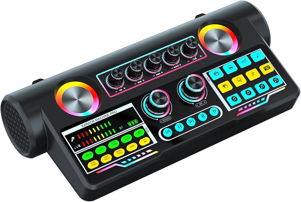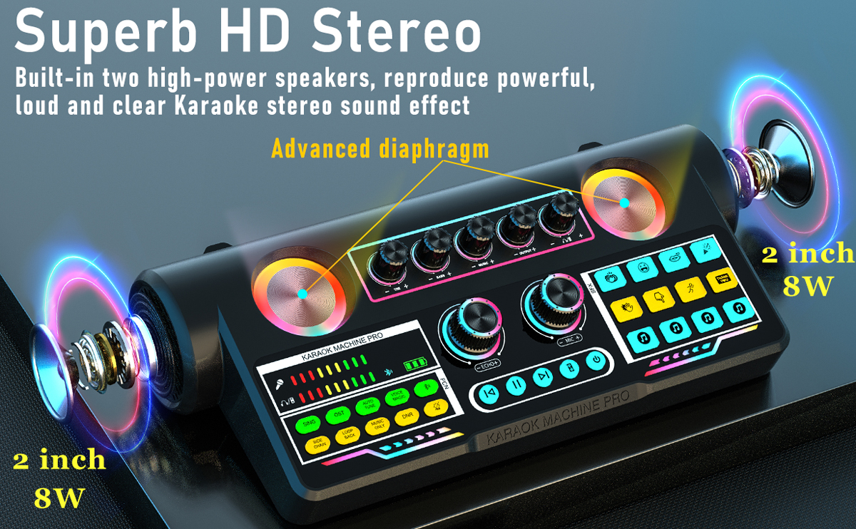 خلاط صوت ومكبر صوت أيضًا: آلة الكاريوكي المحمولة المنزلية S900 مبنية على مكبري صوت 8 وات 2 بوصة، وطاقة إخراج مصنفة 16 وات، تنتج جودة صوت استريو واضحة وعالية ومفعمة بالحيوية، وتخلق متعة رائعة للأذن وتأثير الكاريوكي لحفلتك، الاستماع للموسيقى والغناء.