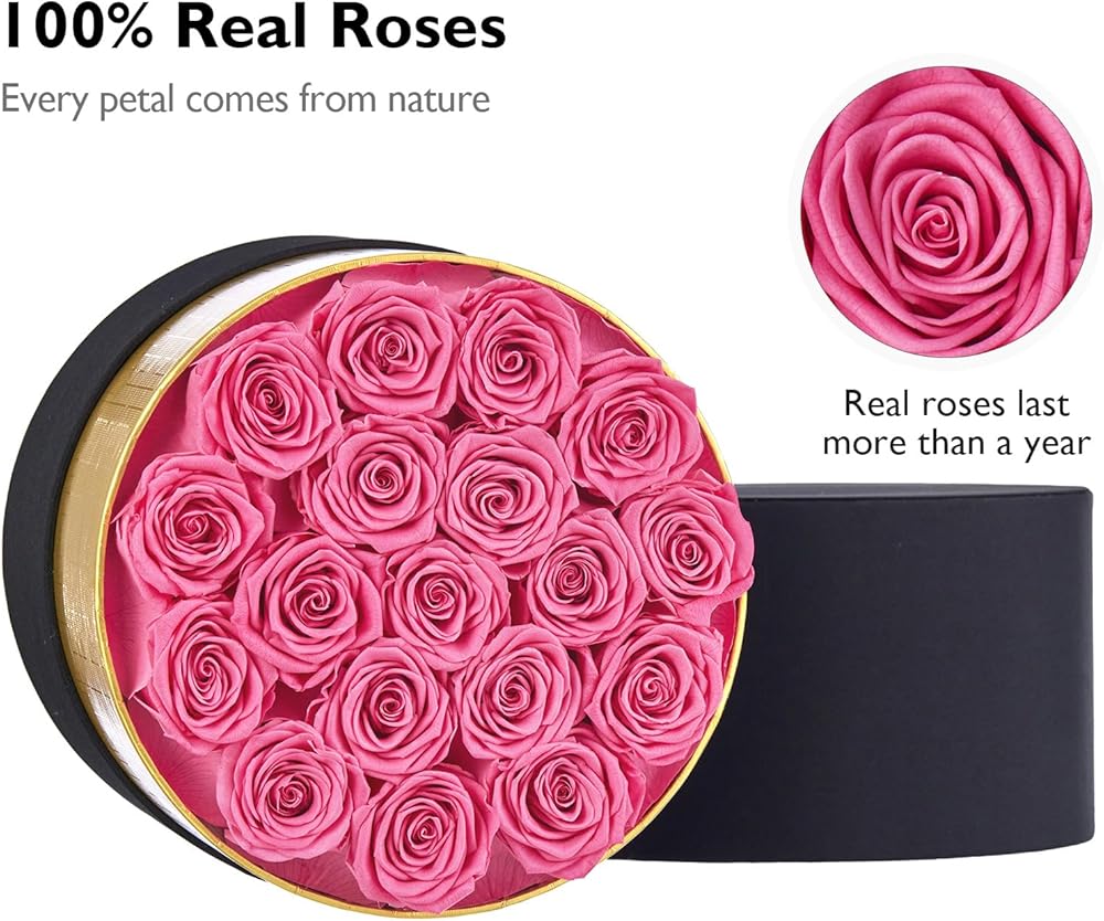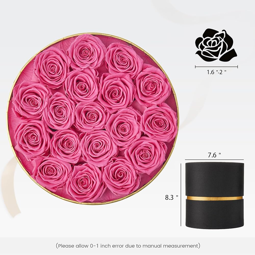 ورود مزهرة بشكل مثالي: يحتوي كل صندوق على 18 وردة محفوظة مما يجعل صندوق الورد بأكمله أكثر امتلاءً وجاذبية للغاية. قطر الوردة 1.8 - 2 بوصة.