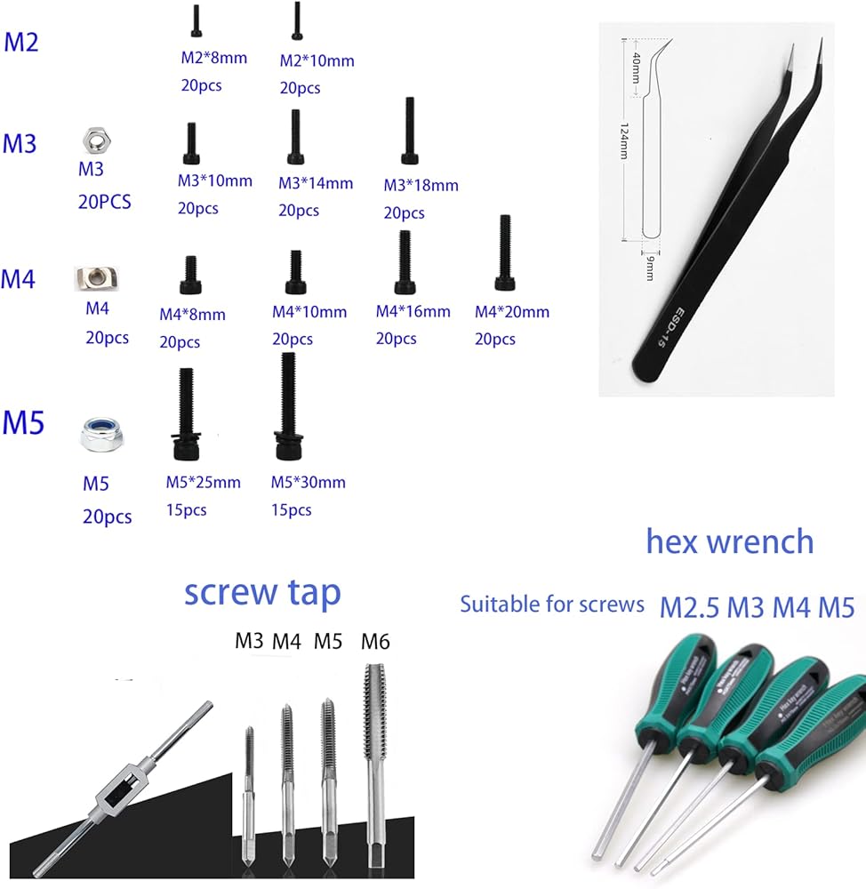 ▲【تفاصيل المنتج】---3 أحجام من البراغي M3M4M5، مجموعة مفاتيح ربط سداسية: H2(M2.5) H2.5(M3) H3(M4) H4(M5)، مجموعة مفاتيح الصنبور: M3 M4 M5 M6. أطوال الخيط M2:8mm/10mm.M3:10mm/14mm/18mm.M4:8mm/10mm/16mm/20mm.M5:25mm/30mm.وفقا للنظام المتري الموحد. ومتوسط الخطأ أقل من 0.01 ملم.