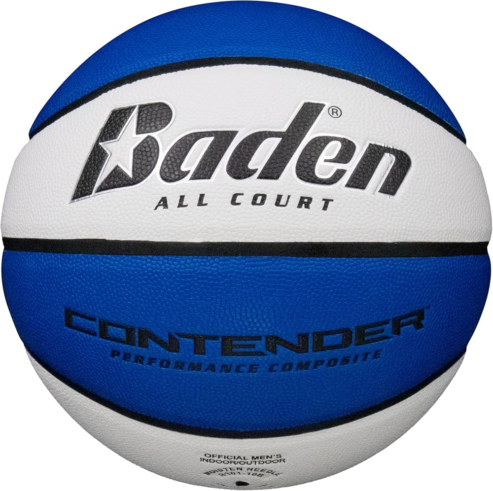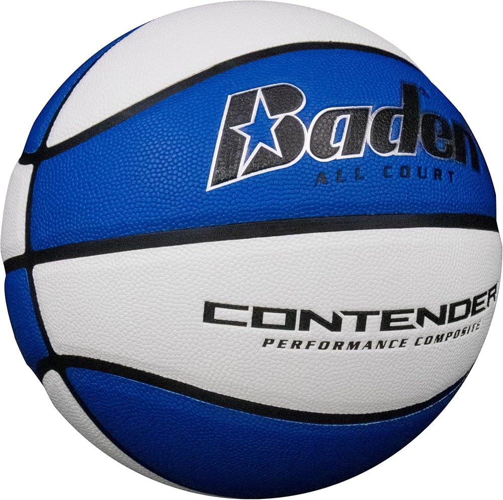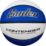 Baden's Contender Basketball boasts a high-quality composite cover designed for indoor/outdoor basketball play. The basketballs symmetrically designed and Stealth Soft-Valve System reduces the amount of exposed rubber from the valve stem, delivering a consistent and reliable playing experience. This balls primary use is as a recreational, camp, and youth practice basketball. The Contender comes in 4 different color combinations, including traditional orange, royal blue, red/white, and red/navy/white. The ball comes in 3 sizes, Junior Size (27.5”), Intermediate Size 6 (28.5”) and official Size 7 (29.5”).