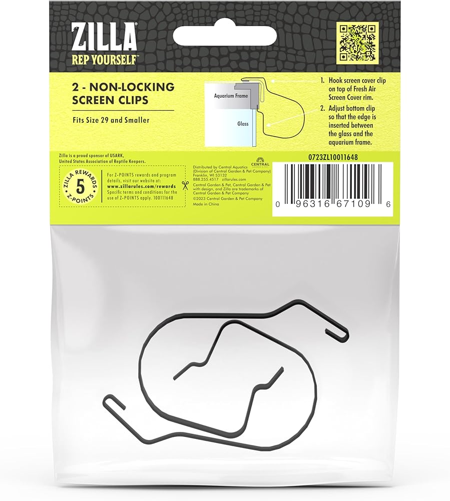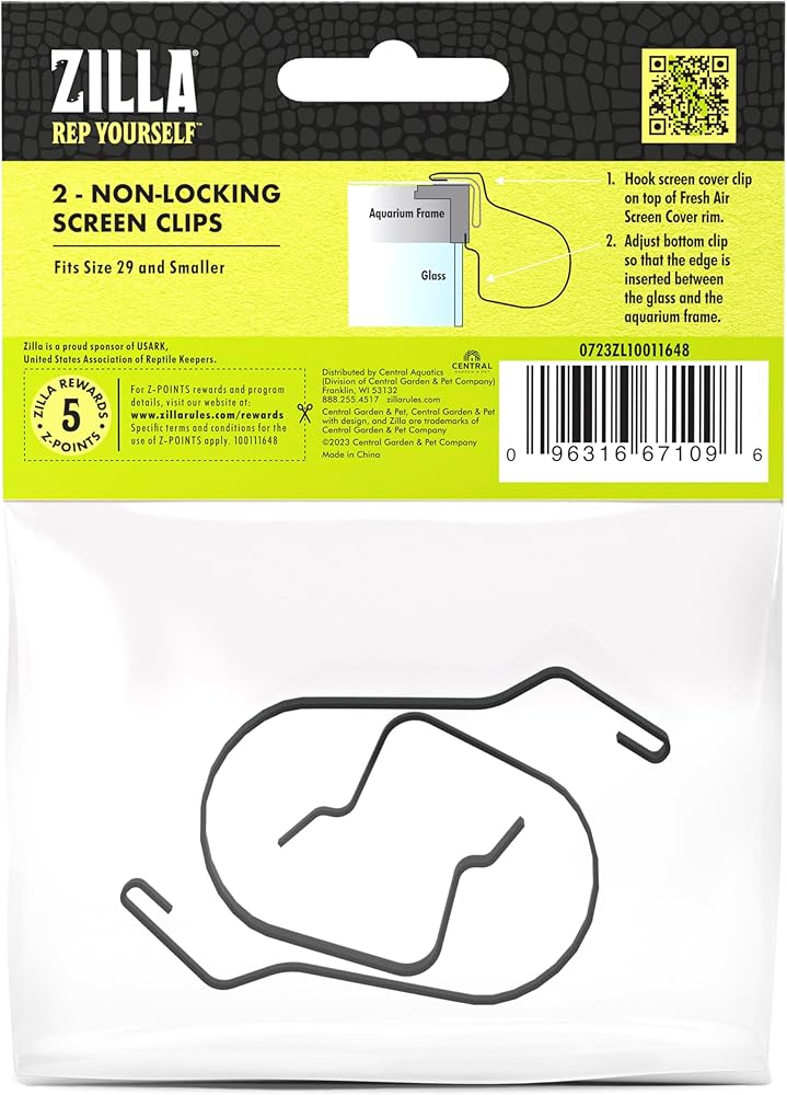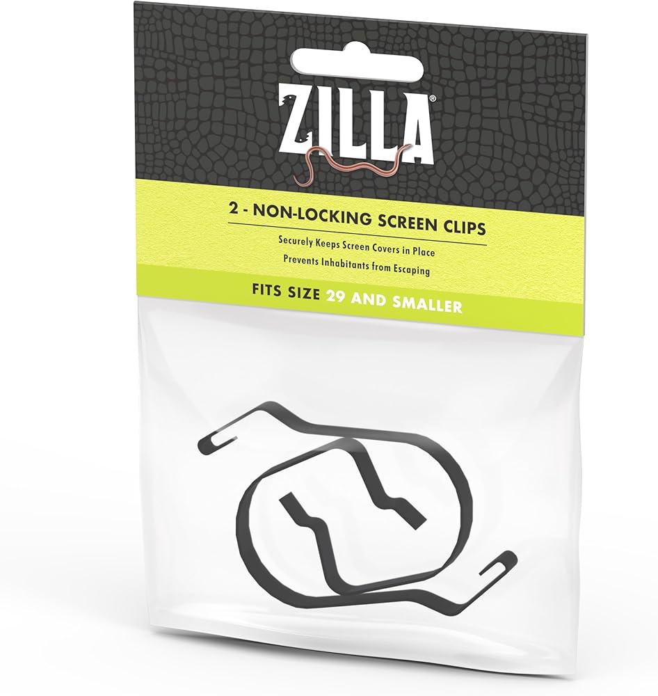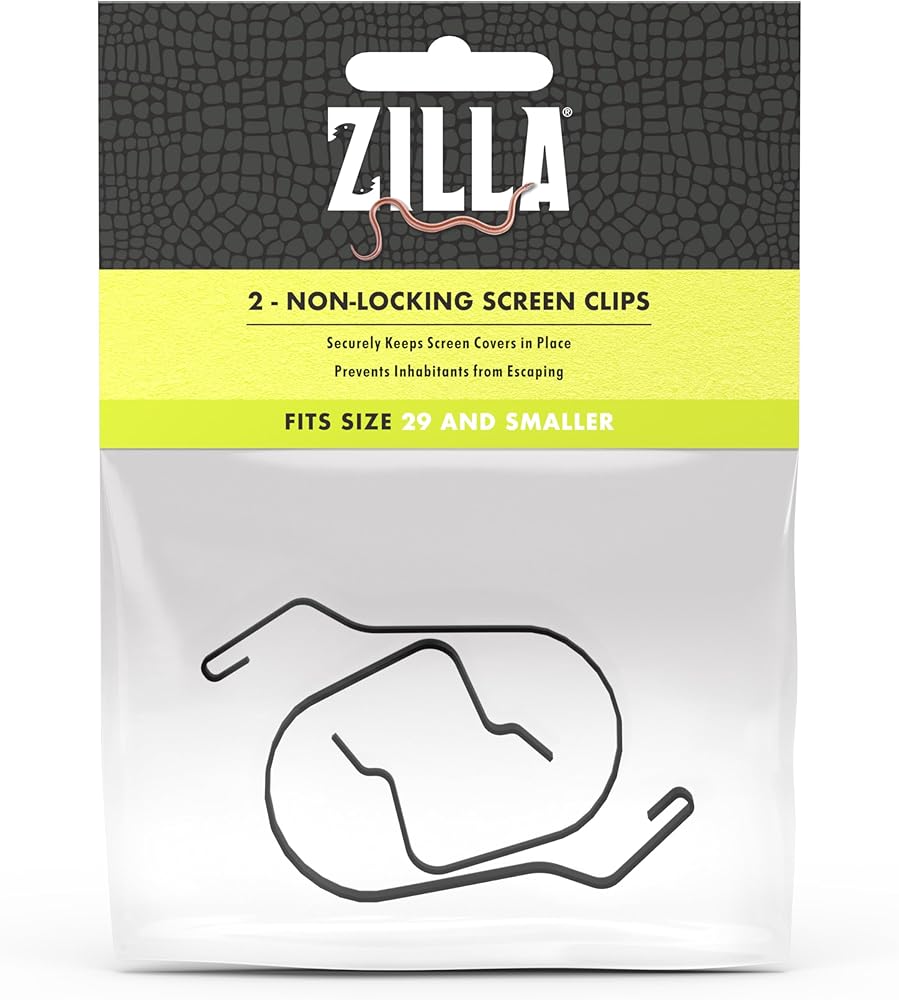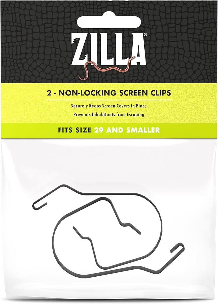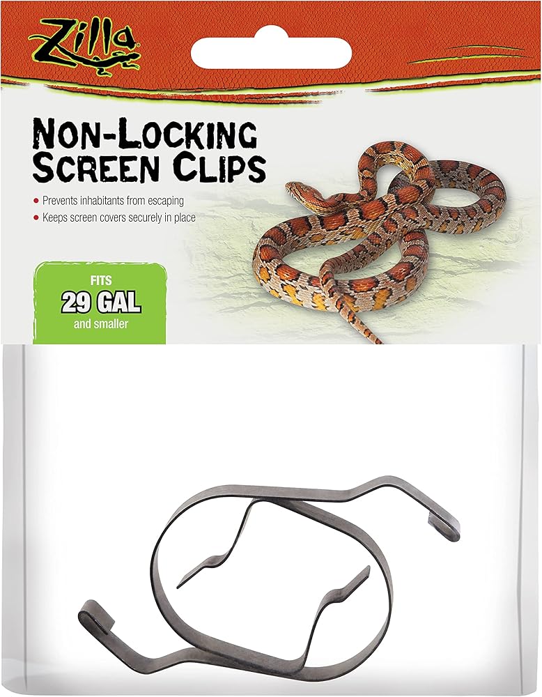 Each clip firmly secures a corner of the Screen Cover to the terrarium rim without the use of extra hardware or complex installation. Simply slip the top of the clip into the top molding of the Screen Cover, then snap the clip's bottom between the glass and the terrarium frame.